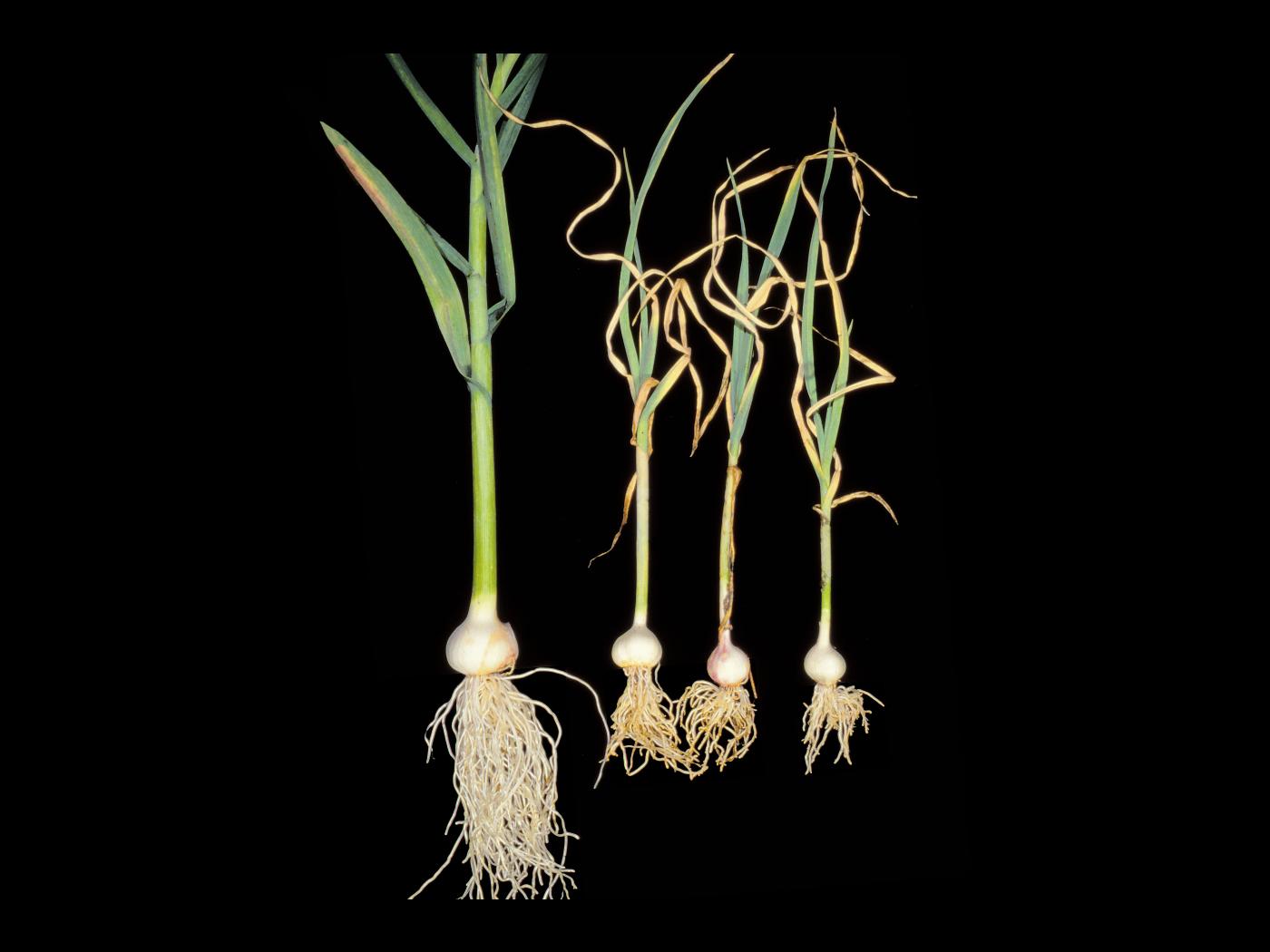 Racine : inhibition de l'élongation des racines engendrant le développement d'un système racinaire court, rabougri, cassant et ayant l'aspect d'un buisson. Les racines sont parfois jaunes à brunes.
