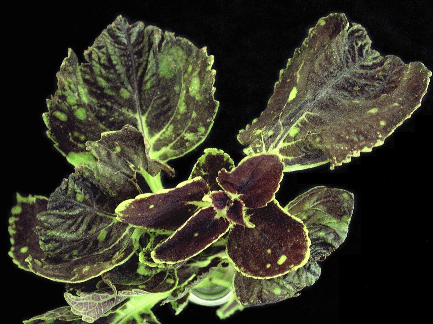 Légende: Taches vertes et apex tronqué sur feuilles de coléus