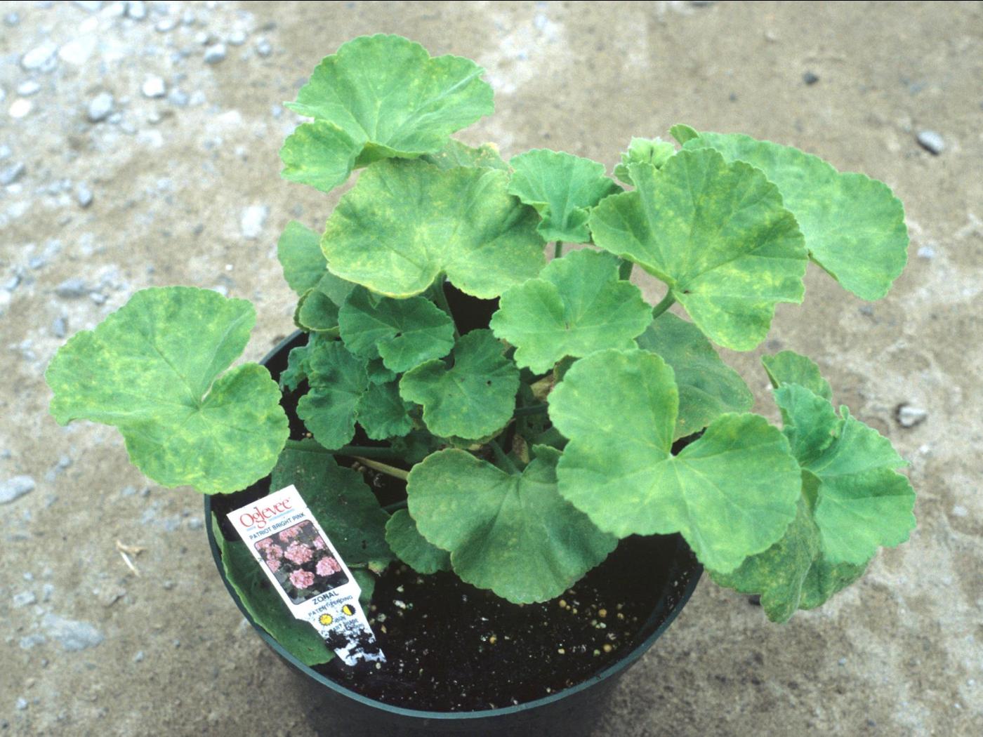 Description: Un plant de géranium zonal provenant d’une serre montre de petites taches beiges et sèches entre les nervures. Elles sont plus abondantes sur les vieilles feuilles et leur quantité diminue vers le haut du plant. Sur les feuilles basales, présence d’une fine brûlure marginale et parfois d’un rougissement du limbe. Le pH du substrat est acide (pH 4,5). Le géranium est efficace à absorber le fer ou le manganèse lorsque le pH se situe entre 4,5 et 5,7. Le géranium zonal exige un pH entre 6,0 et 6,6.