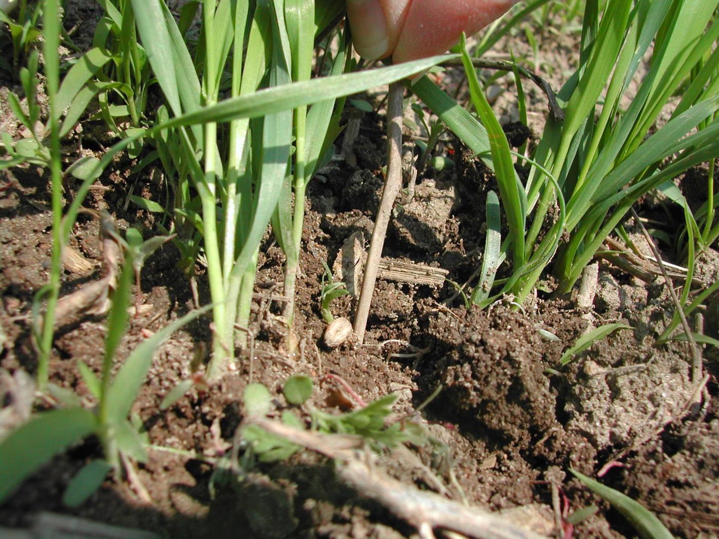 Description: Sur des pousses de blé de printemps, les racines sont faiblement à moyennement développées. Le système racinaire du plant du bas est particulièrement affecté. Il est impossible de distinguer les racines secondaires (coronales) des racines primaires (séminales). Les racines secondaires devraient se trouver au-dessus des racines séminales alors qu’elles sont absentes ou accolées à la graine. Ces symptômes sont dus à un semis effectué trop superficiellement (1 cm (0,4 po)).