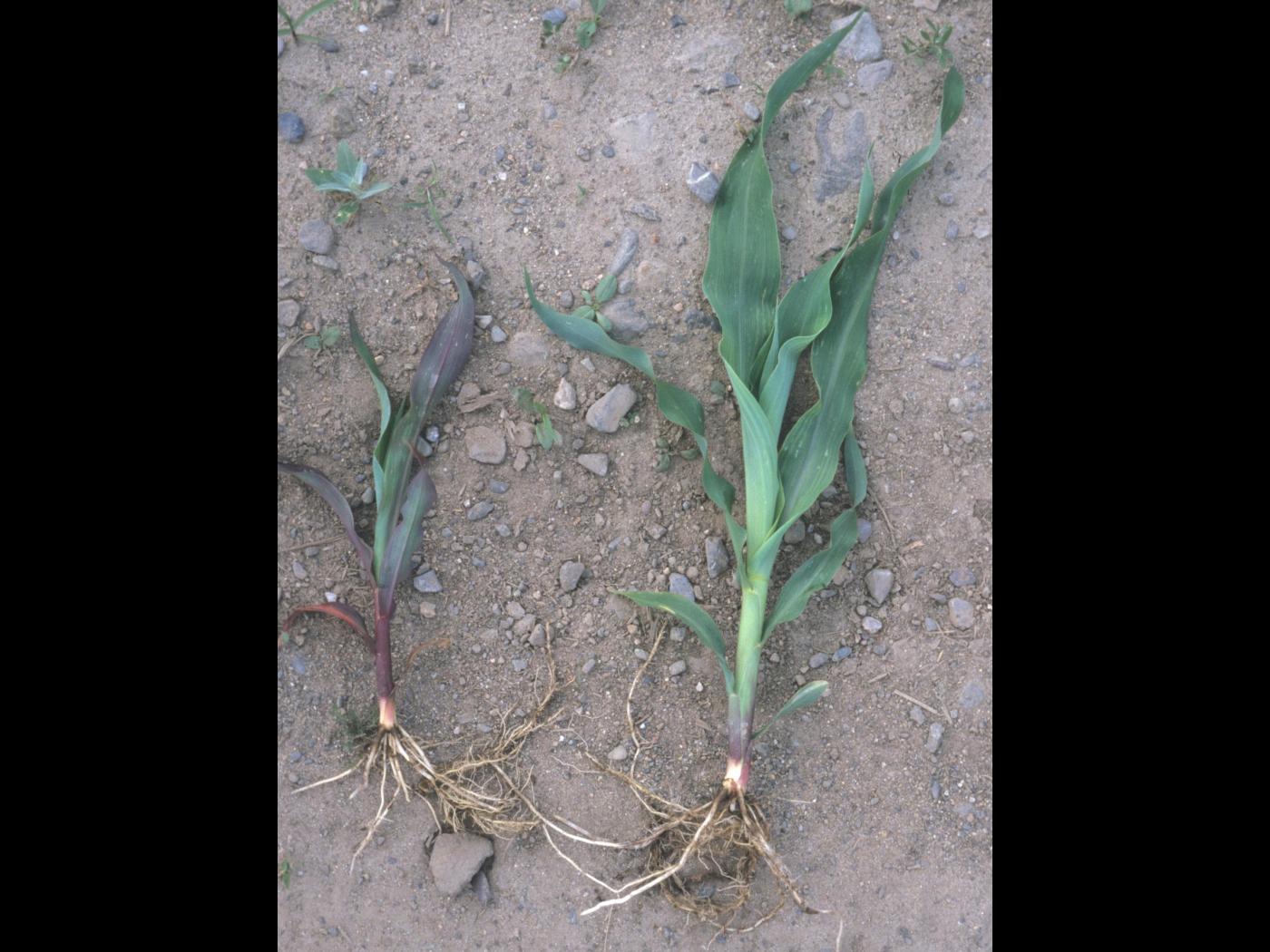Les dommages causés par le froid peuvent être confondus avec une carence en phosphore. Les plants de maïs qui ont une carence en phosphore sont distribués d’une manière éparse au champ ou ont plus de 6 à 8 feuilles. La carence en phosphore peut être induite lorsqu’elle survient dans des sols froids lorsque les plants sont au stade plantule. Si tous les plants sont mauves, les dommages sont de nature génétique.