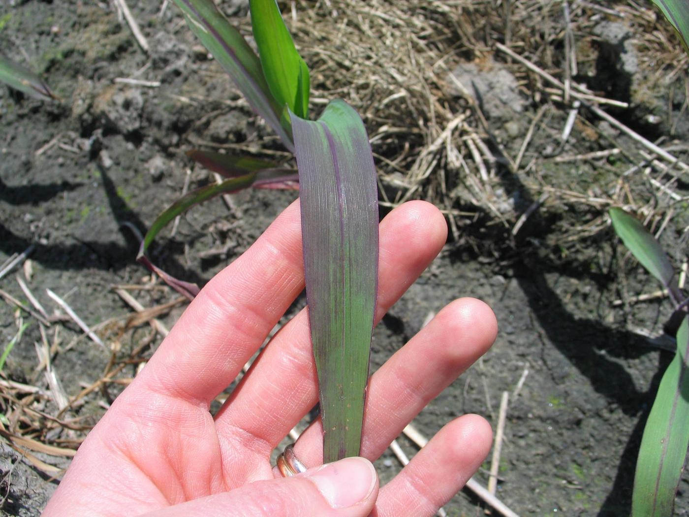 Le froid ralentit la croissance au printemps, mais n’a pas d’incidence sur la croissance par la suite ni sur les rendements, car l’accumulation de l’anthocyane se fait dans la couche supérieure des cellules et n’affecte pas le contenu en chlorophylle de la plante, expliquant pourquoi les feuilles redeviennent vertes par la suite et ont une croissance normale. Les plants affectés sont distribués assez uniformément au champ. Les dommages liés au froid sont occasionnels et mineurs.