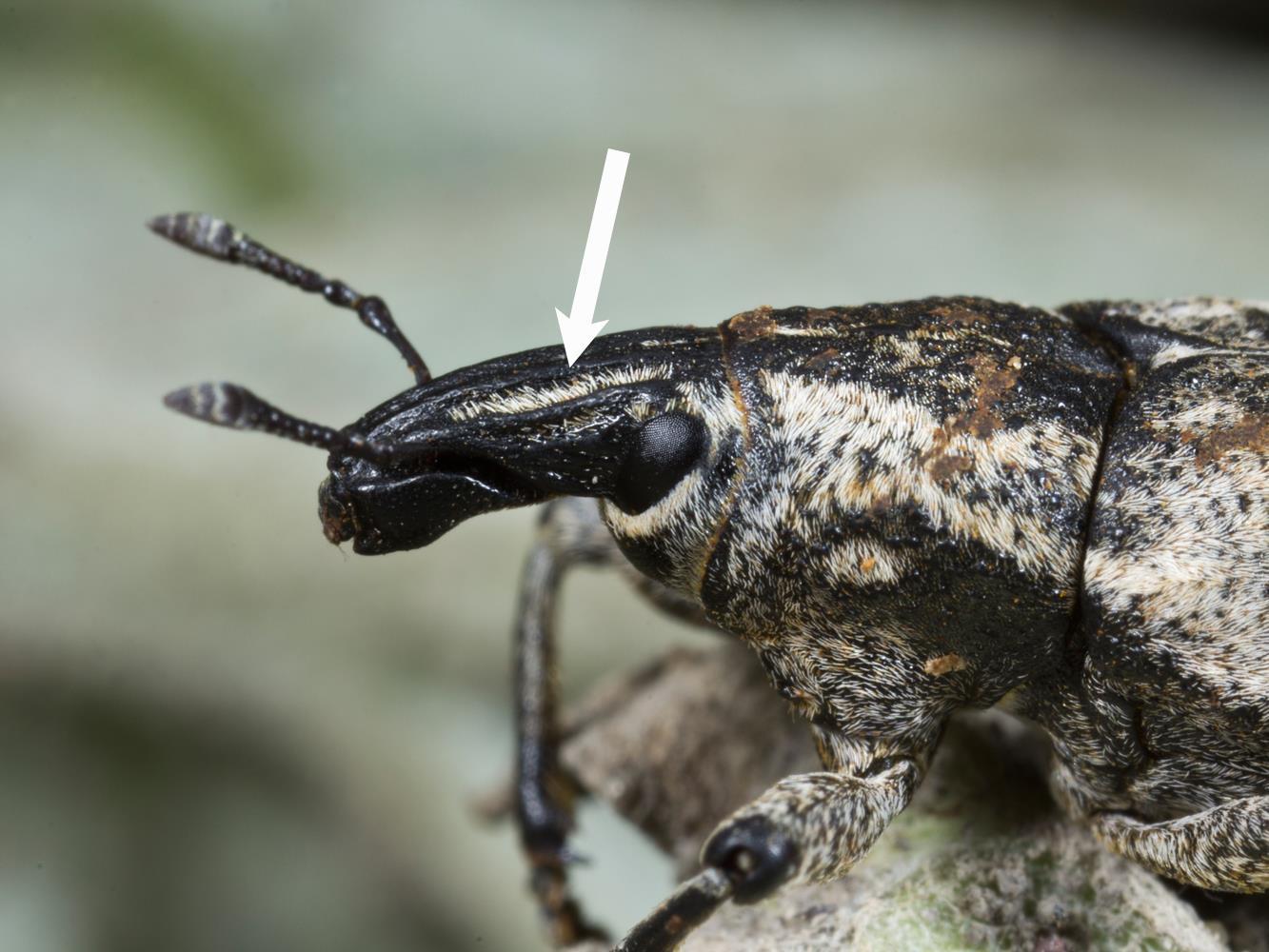 Légende: Cleonis piger possède trois larges sillons sur le dessus du rostre. Les deux sillons latéraux sont recouverts de poils grisâtres tandis que celui du centre est généralement glabre.