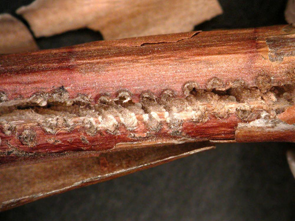 Description: Portion d'une tige de framboisier présentant des dommages causés par un grillon du genre Oecanthus sp. La femelle grignote l'écorce externe puis insère ses oeufs individuellement à l'intérieur de petites perforations disposées en rangées. Une série peut compter 80 oeufs et s'étendre sur 7,5 cm. Les perforations de ponte empêchent la sève de monter et affaiblissent la canne qui devient alors sensible aux bris mécaniques ainsi qu'aux pathogènes.