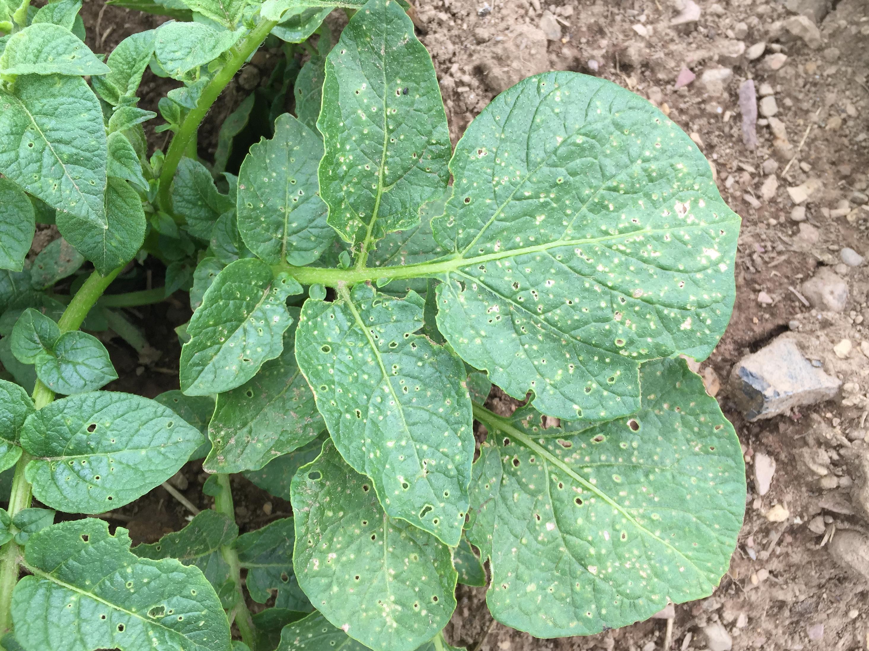 Description: Feuillage d'un plant de pomme de terre présentant des dommages causés par l'altise de la pomme de terre. Ces dommages se présentent sous la forme d'une multitude de petits trous arrondis dans le limbe des feuilles.