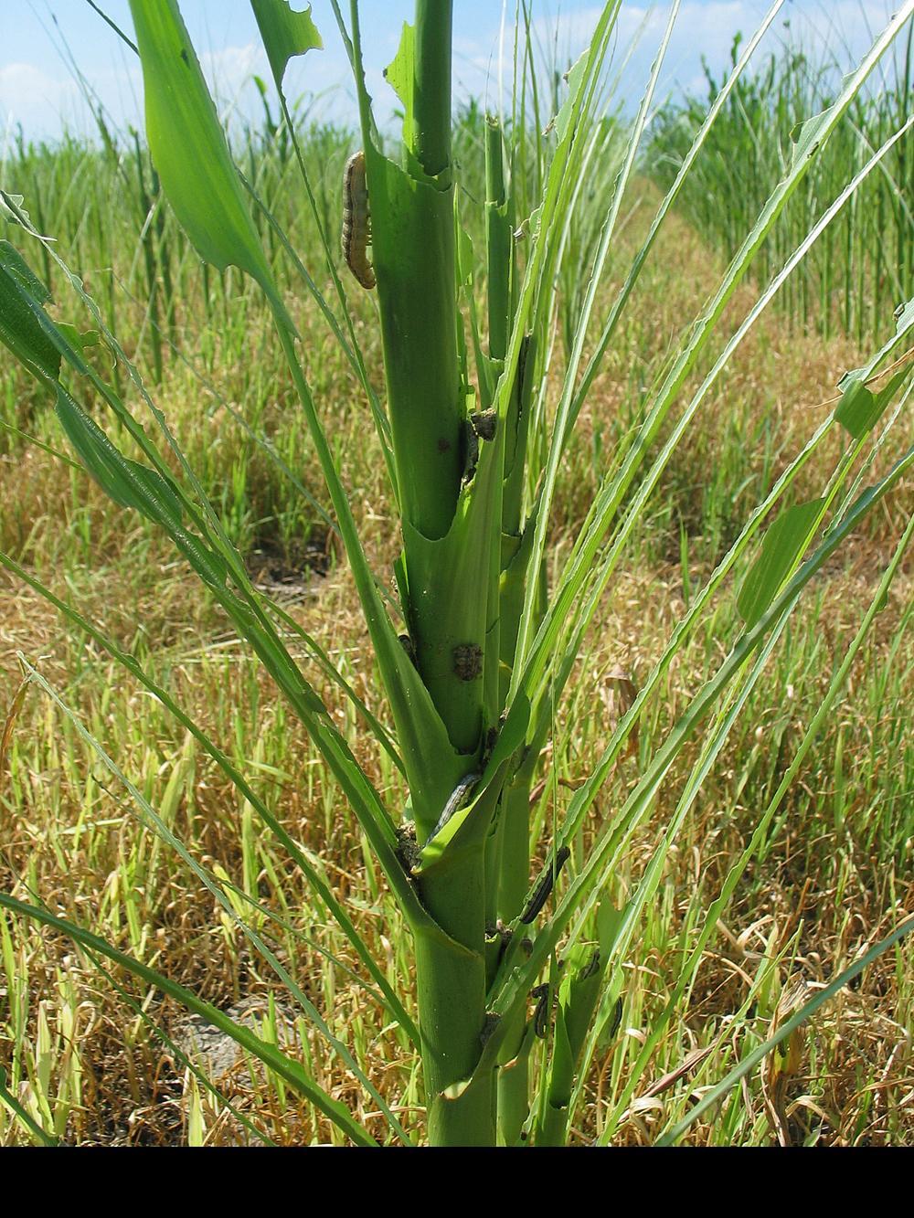 Plant de maïs sévèrement endommagé par la légionnaire uniponctuée : ce ravageur est principalement associé aux plantes de la famille des graminées. Il s’attaque principalement aux céréales et aux maïs, mais peut se retrouver sur une multitude de plantes horticoles ainsi que de mauvaises herbes. Les dommages sont causés par les larves qui grignotent les feuilles, causant parfois une défoliation très sévère des plants.