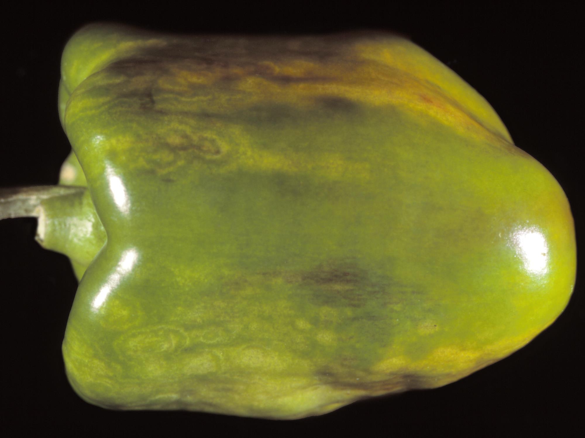 Description: Un poivron de champ montre des taches en anneaux jaunes. L’épiderme tend à devenir jaune. Les tests de laboratoire ont révélé la présence du virus de la mosaïque du concombre (CMV).