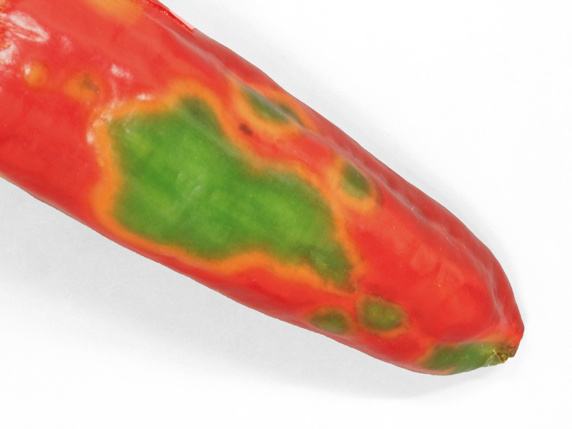 Description: Une vue rapprochée de l’épiderme d’un poivron de serre (cv 'Ramiro') montre des taches circulaires vertes avec un halo jaune. Elles sont de différentes grosseurs. Les tests de laboratoire ont révélé la présence du virus de la tache nécrotique de l’impatiente (INSV).