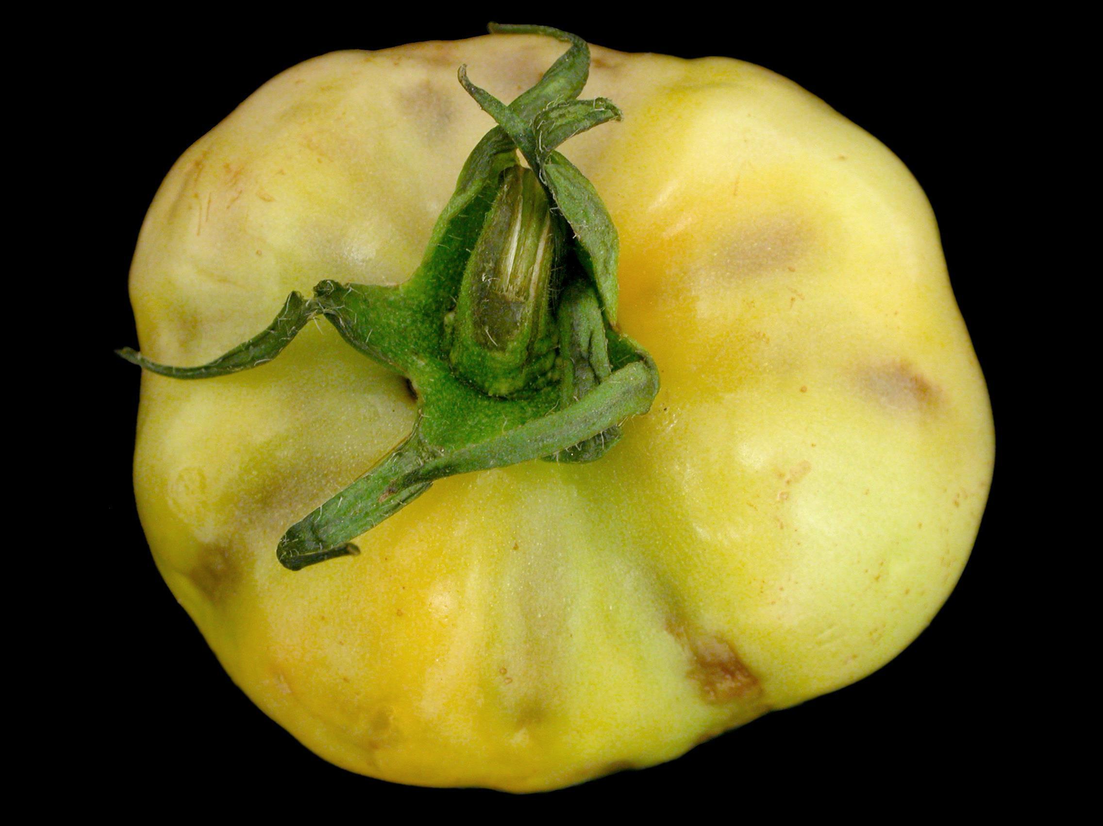 Description: L’épiderme d’une tomate de champ montre quelques taches brunes déprimées, d’une forme variable. La surface prend une apparence bosselée. Le pédoncule est sans symptôme. Les tests de laboratoire ont révélé la présence du virus de la mosaïque de la luzerne (AMV).