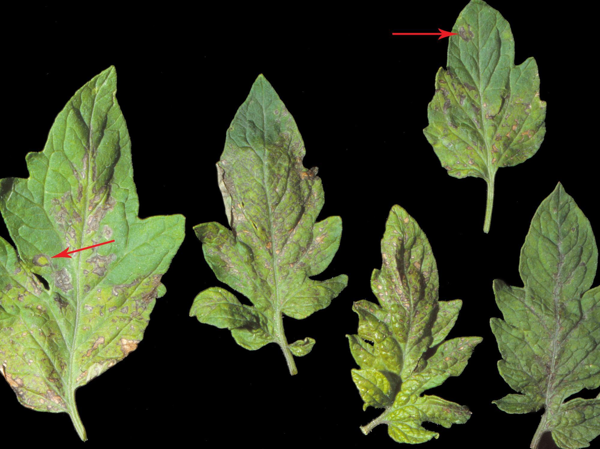 Description: Des folioles de tomate de serre montrent de nombreuses taches ou brûlures angulaires brunes, localisées entre les nervures et distribuées aléatoirement sur le limbe. Quelques taches en anneaux sont observées (voir flèches). Les tests de laboratoire ont révélé la présence du virus de la maladie bronzée de la tomate (TSWV).