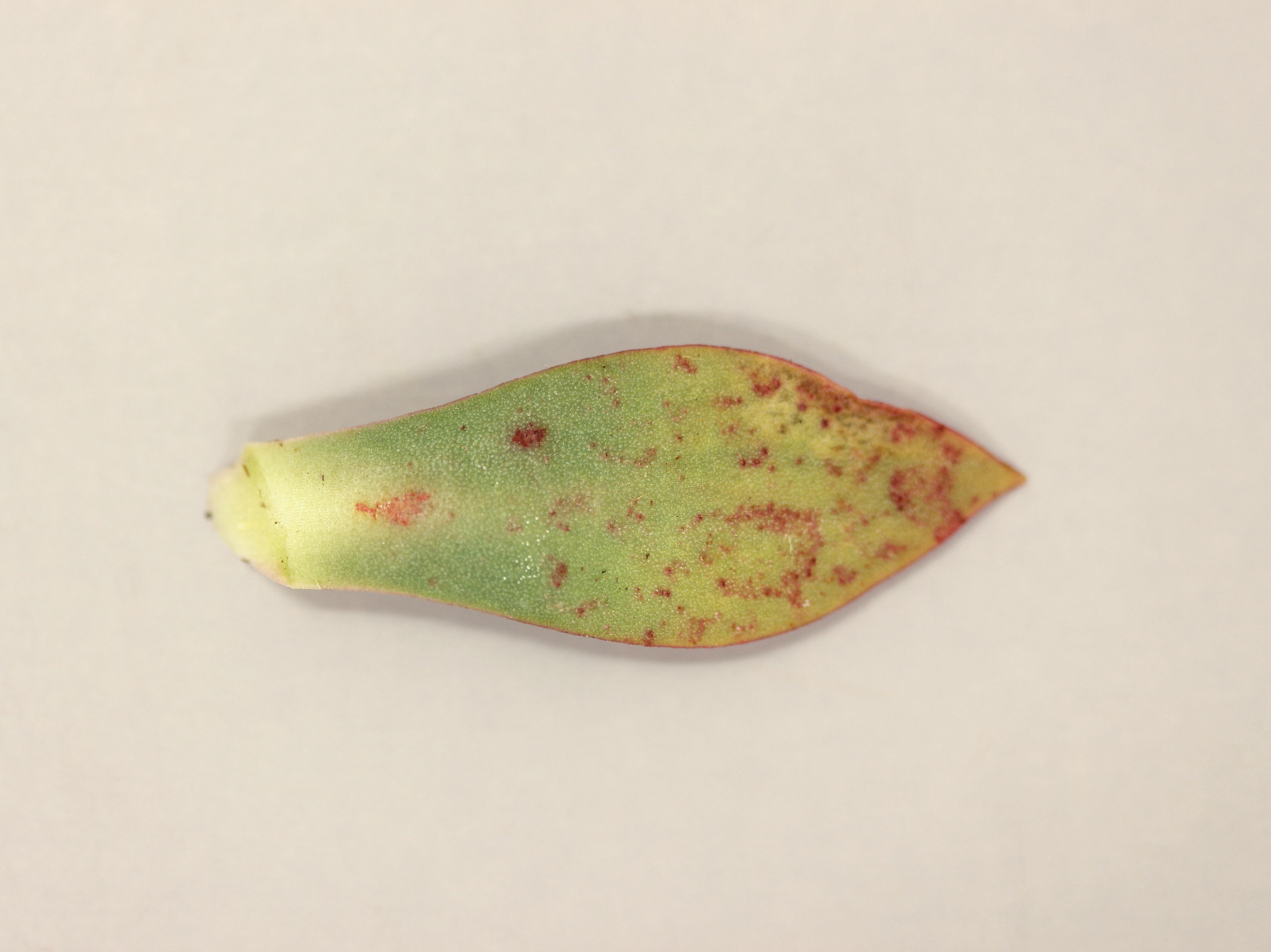 Description: Une feuille de Lewisie du Siskiyou montre des taches rouges avec une marge irrégulière. Le diamètre des taches est variable. Les feuilles basales sont les plus affectées. Les tests de laboratoire ont révélé la présence du virus du flétrissement de la fève (BBWV) qui comprend les deux espèces BBWV-1 et BBWV-2.