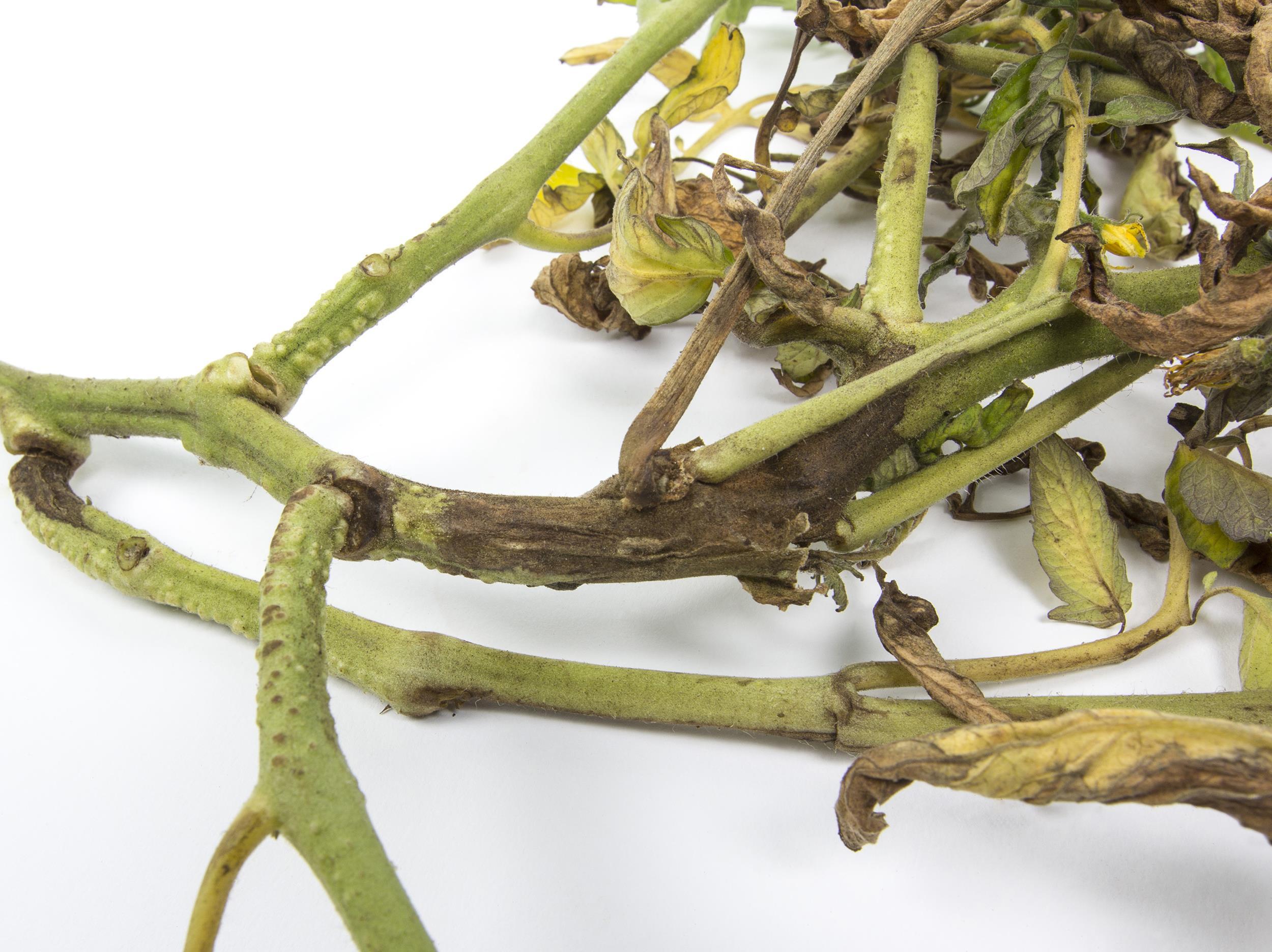 Description: Une vue rapprochée d’une tige de tomate de champ montre des racines adventives et des chancres bruns à noirs dans lesquels les tissus s'affaissent. Le chancre progresse également sur le pétiole des feuilles. Les feuilles localisées dans les zones supérieures aux chancres sont jaunes et flétries. Les tests de laboratoire ont révélé la présence de la bactérie Pseudomonas corrugata, responsable de la moelle noire chez la tomate.