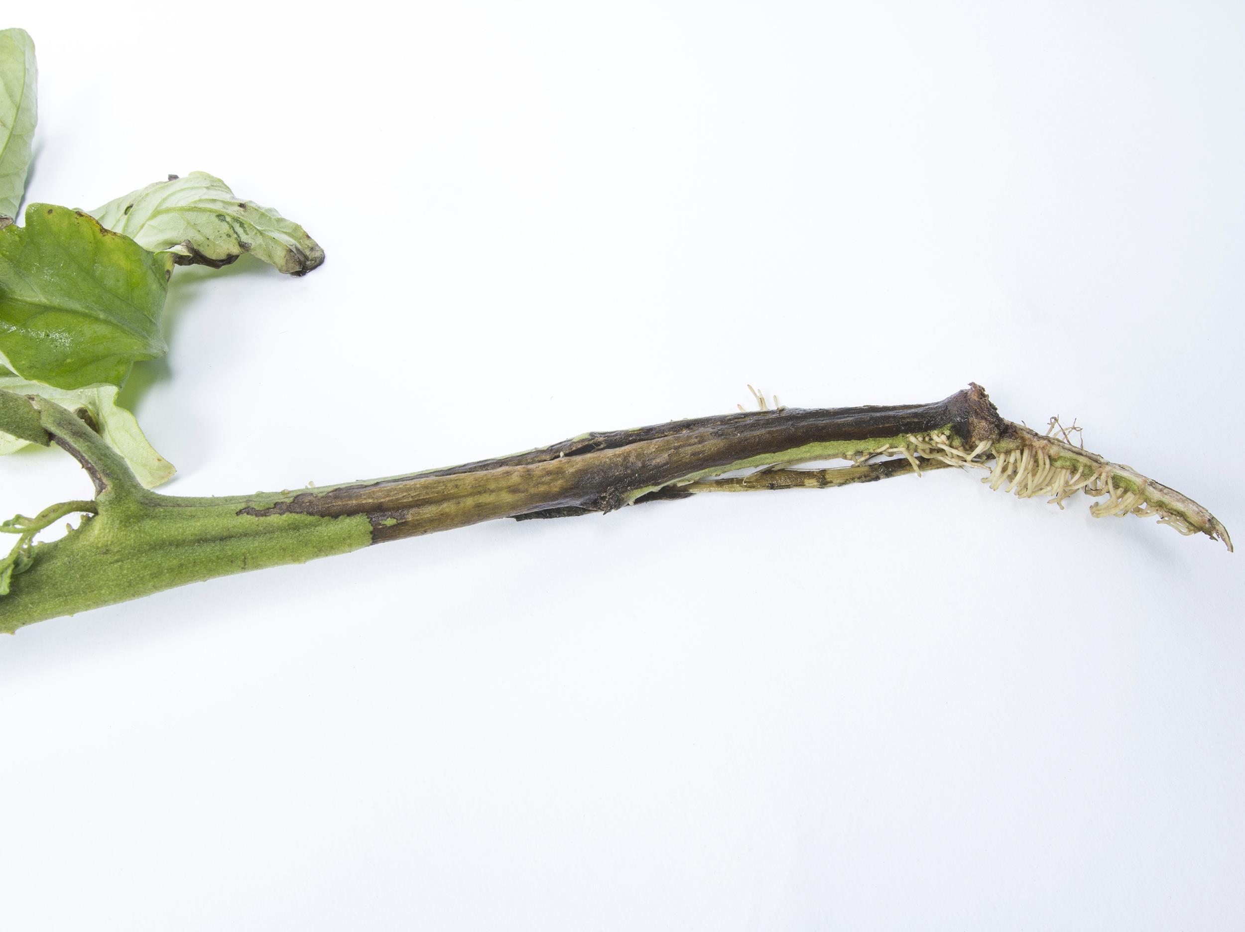 Description: Une vue rapprochée d’une tige de tomate de champ (cv 'Prima Red') montre des racines adventives et un chancre brun à noir dans lequel les tissus s'affaissent. Le chancre progresse vers le haut. Les feuilles localisées dans les zones supérieures aux chancres sont jaunes et flétries (non visible ici). Les tests de laboratoire ont révélé la présence de la bactérie Pseudomonas corrugata, responsable de la moelle noire chez la tomate.