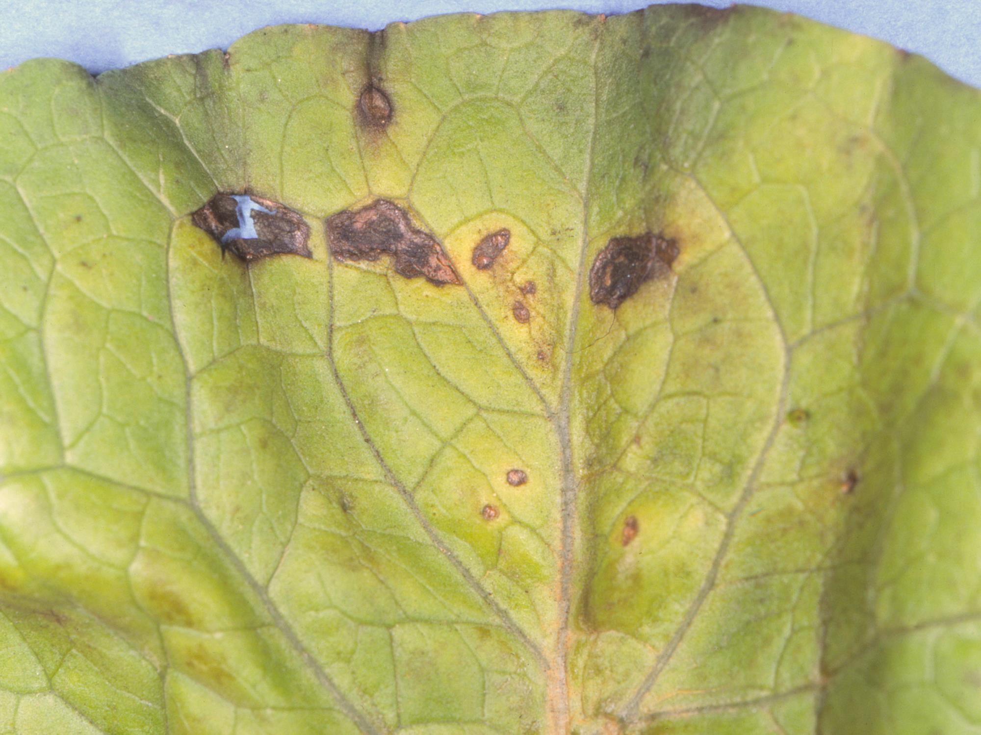 Description: Une vue rapprochée d’une feuille de laitue romaine montre des taches brunes irrégulières, diaphanes et souvent fendues, localisées près des nervures secondaires dans la zone apicale. Les tests de laboratoire ont révélé la présence de la bactérie Xanthomonas axonopodis pv. vitians, responsable de la tache bactérienne chez la laitue.