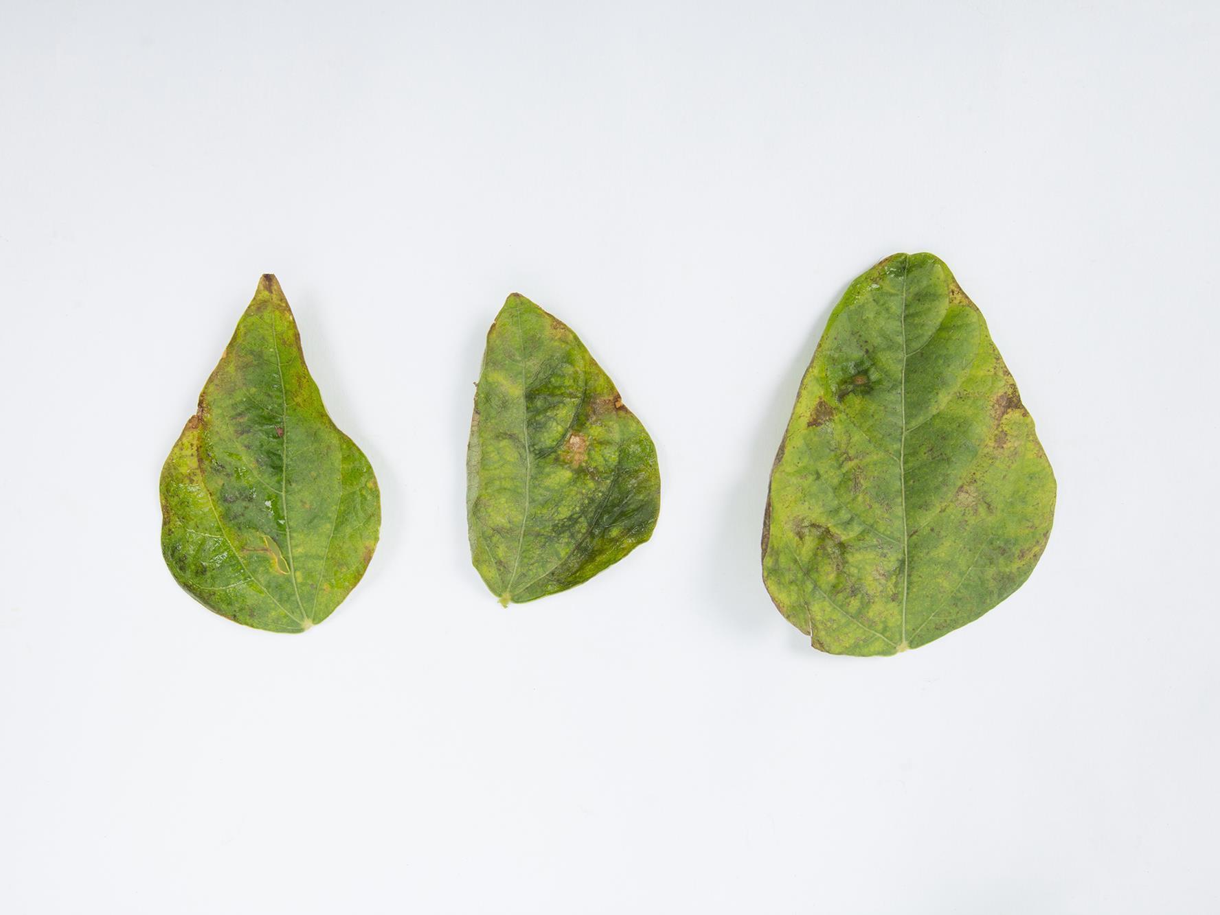 Description: Trois feuilles de haricot montrent des taches à contour diffus, beiges avec une marge brune, à la face supérieure. Un halo jaune est parfois présent. Les taches sont surtout localisées à la marge. Ces feuilles sont aussi finement ponctuées et jaunies. Les taches sont moins visibles sur la face inférieure des feuilles (non visible ici). Les tests de laboratoire ont révélé la présence de la bactérie Pseudomonas syringae. Il s’agit probablement de P. s. pv. syringae, responsable de la graisse bactérienne (tache brune bactérienne) chez le haricot puisque les taches ne débutent pas à la face inférieure.