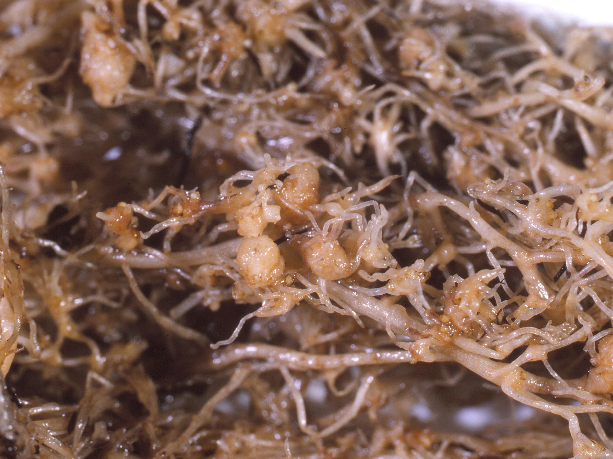 Description: Une vue rapprochée du système racinaire d’un plant de tomate de serre montre de petits renflements pâles répartis aléatoirement sur les racines. Les tests de laboratoire ont révélé la présence de plus de 1 000 larves du nématode Meloidogyne sp. par 100 ml de sol, ce qui est 100 fois le seuil de nuisibilité établi (10). Ce nématode est responsable de la nodosité des racines.