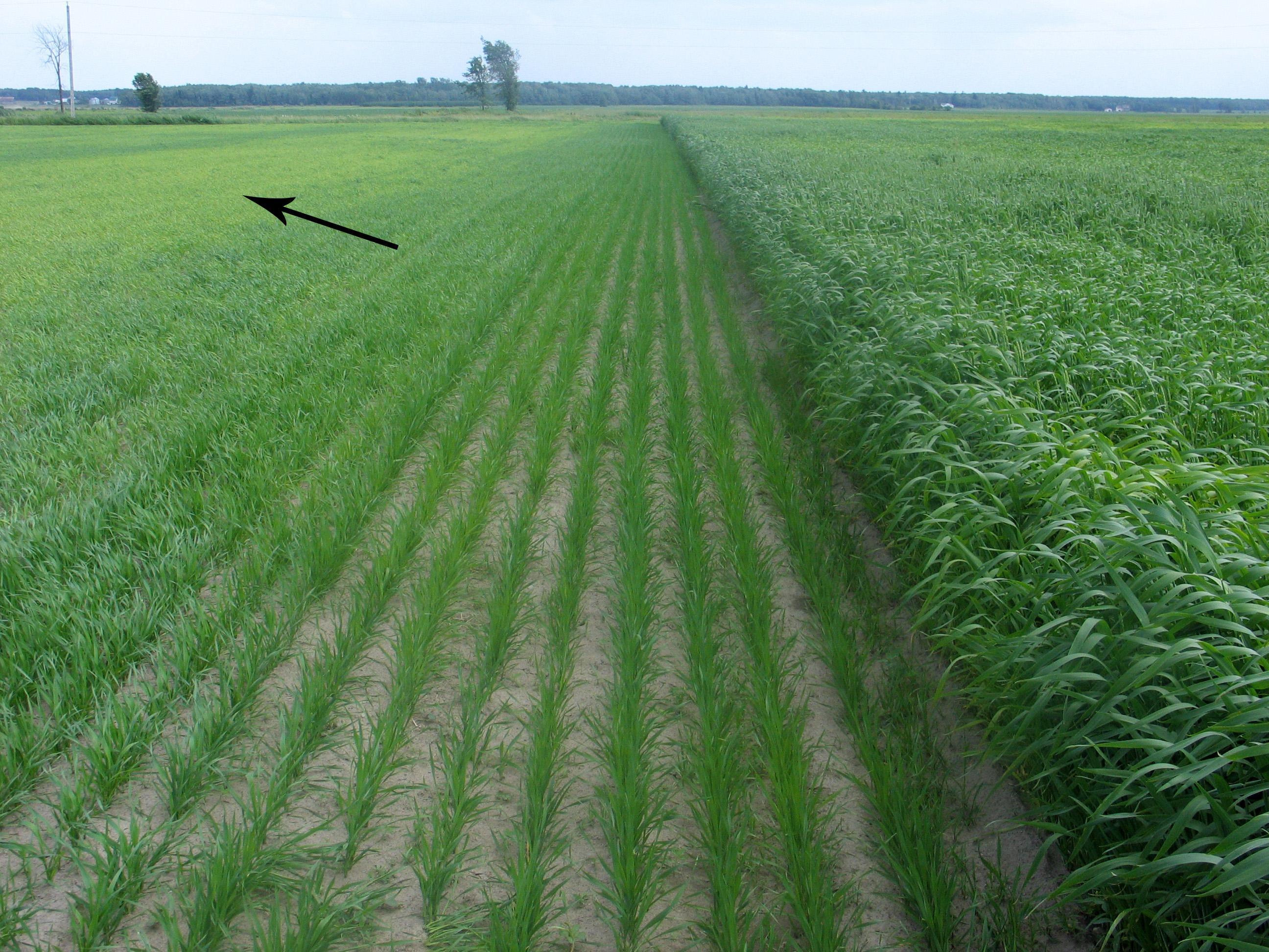 Description: Une moitié du champ de blé de printemps est plus développée et a été traitée au sulfate de manganèse (MnSO4). L’autre partie du champ n’a pas été traitée, mais quelques rangées de plants, situées juste à côté de la zone traitée, ont reçu involontairement une certaine dose sulfate de manganèse tandis que la partie du champ plus pâle (voir flèche) n’a pas reçu de cet engrais. Ces symptômes sont caractéristiques d’une carence en manganèse. Le sol de la zone affectée est très sableux et pauvre en éléments minéraux. Si des analyses minérales du sol avaient été réalisées chaque année, ce problème aurait pu être évité.