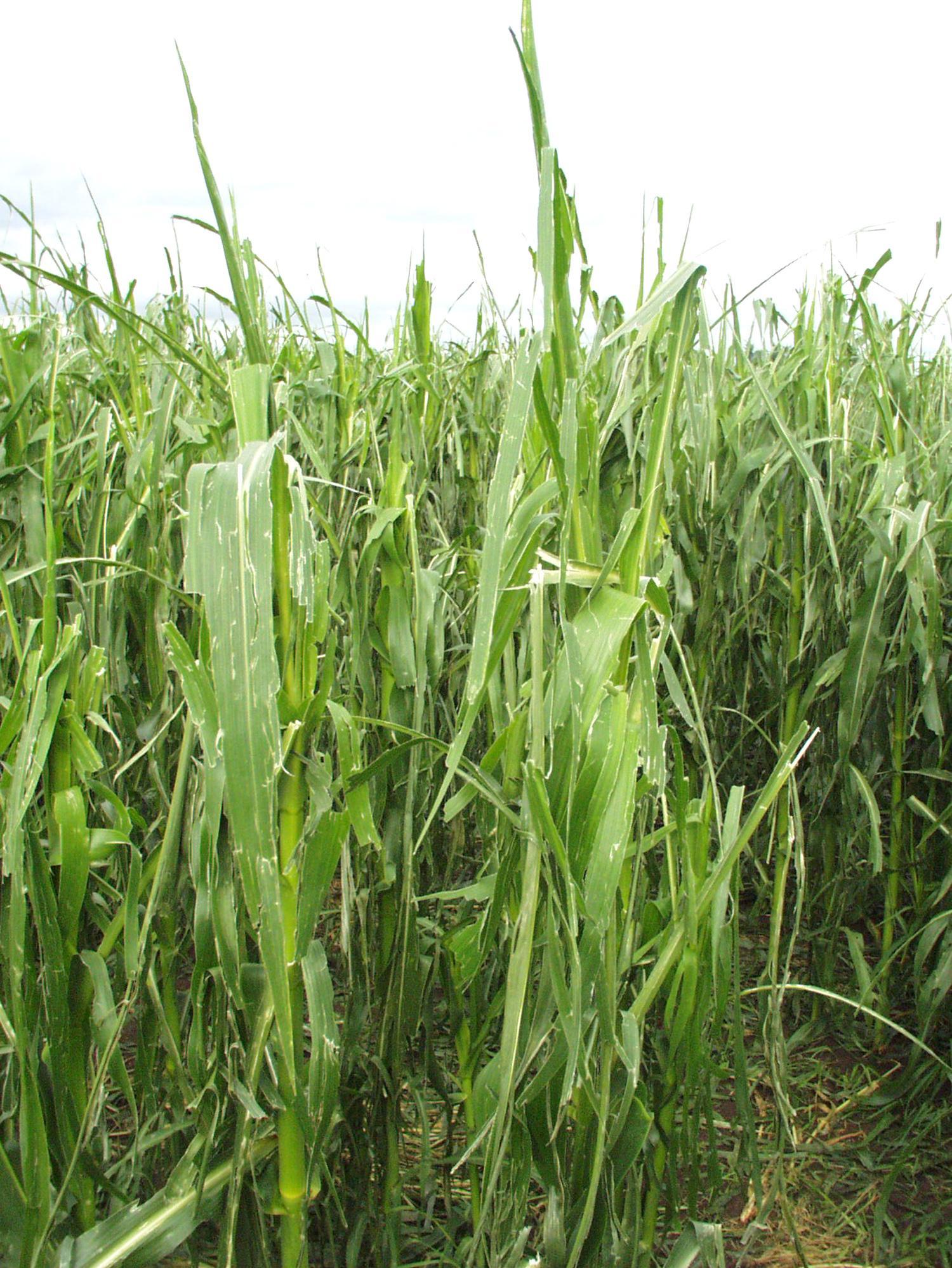 Description: Le limbe de plusieurs feuilles de maïs grain et fourrager s’est déchiré sous l’impact d’un gros épisode de grêle (juillet 2001). Tous les niveaux de feuilles ont été touchés. Les feuilles lacérées sont réparties aléatoirement dans le champ.