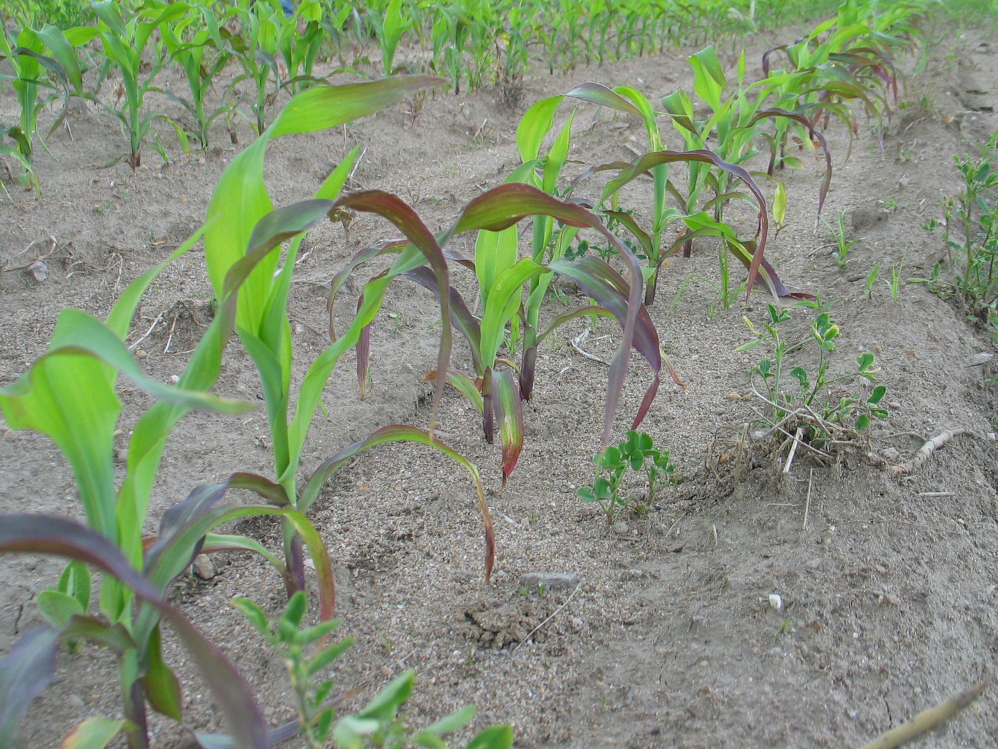 Description: Une vue rapprochée d’une zone d’un champ de maïs grain et fourrager, au stade 5 à 6 feuilles, montre des plants, dont les feuilles basales et quelques feuilles médianes sont mauves. Ce symptôme est caractéristique de basses températures de l'air (froid) en début de saison.