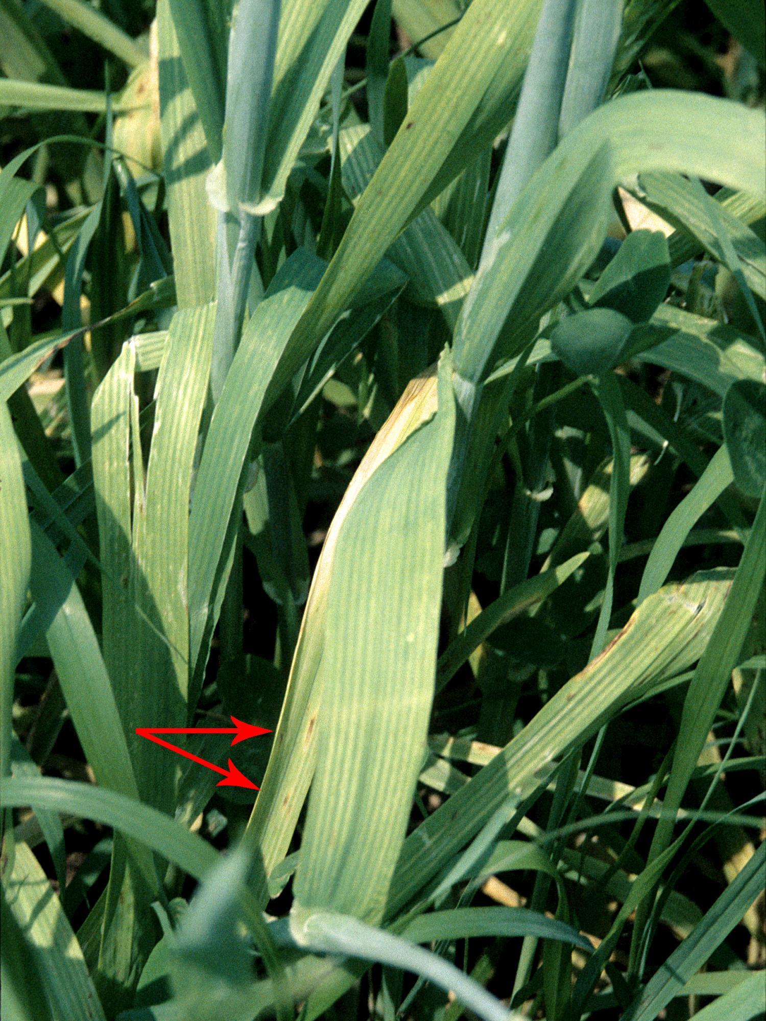 Description: Sur des feuilles d’orge, présence d’un jaunissement ou d’un blanchiment du limbe entre les nervures qui demeurent vertes. Sur quelques feuilles, présence de petites taches ovales grises à brunes le long des nervures (voir flèches). Ces symptômes sont caractéristiques de la carence en manganèse chez l’orge.