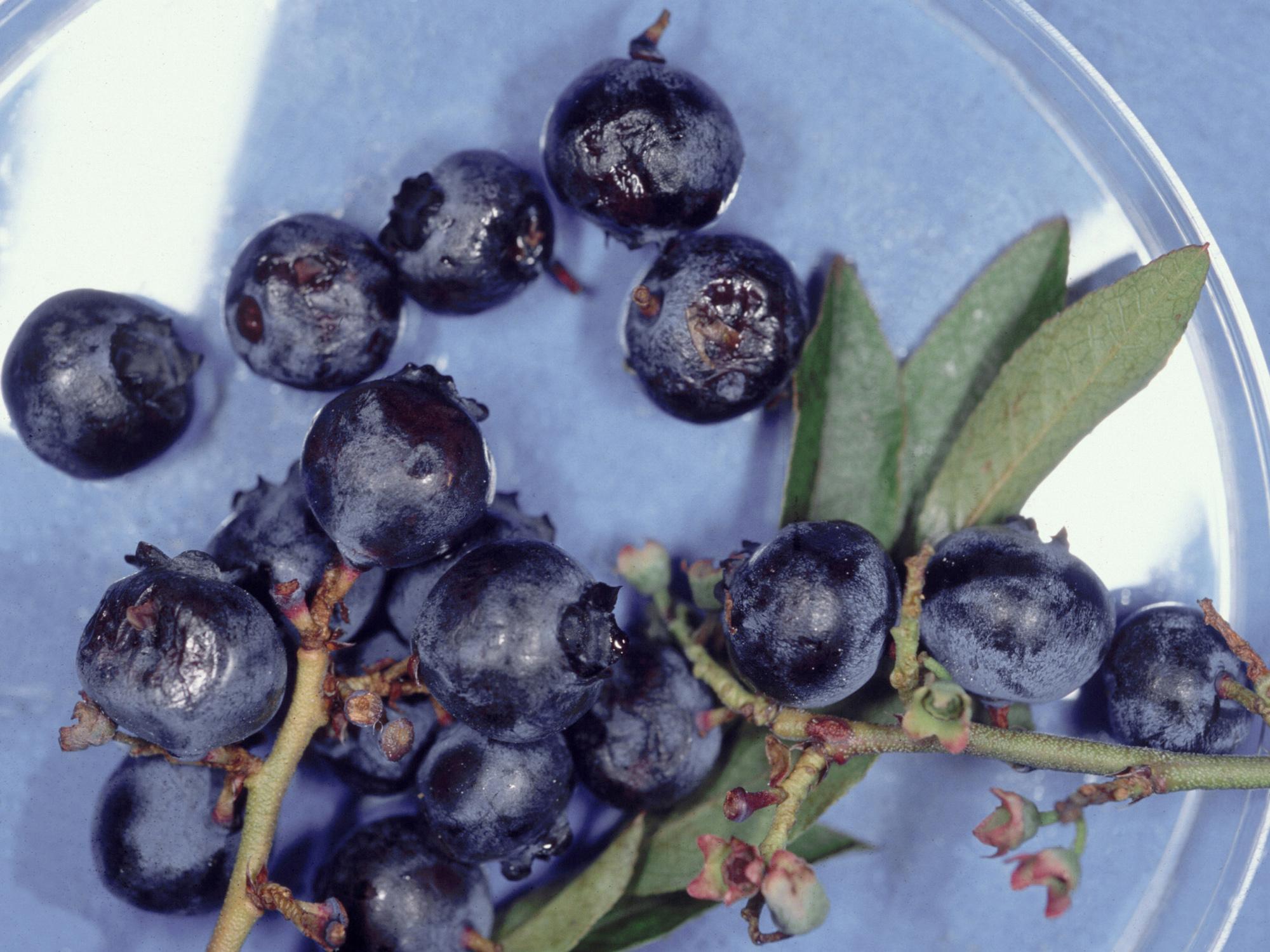 Description: Les bleuets en corymbe montrent une dépression ou un affaissement situé sur un côté ou le dessus de certains fruits. Les fruits sont ramollis et la chair est rouge, comme si les fruits « avaient cuit » au soleil (non visible ici). Sur la base des symptômes et des conditions climatiques chaudes enregistrées au cours de la saison de production, le ramollissement des fruits et la pourriture interne sont causés par une insolation (journée très ensoleillée) jumelée à une température élevée et des conditions sèches.