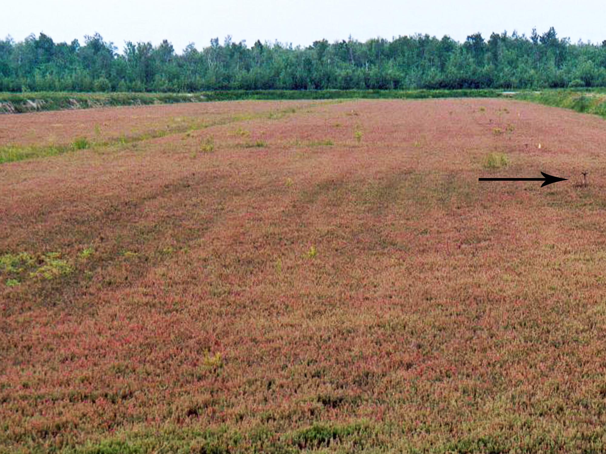 Description: Dans cette cannebergière, les zones brunes sont constituées de plants dont l'apex des feuilles est brun et les feuilles sont disposées en forme de coupe sur le bourgeon floral (non visible ici). Les dommages sont apparus à la suite d’un gel printanier. Dans ce champ, il est possible que le gicleur du système d’irrigation (voir flèche) ait mal fonctionné ou était bouché puisque le gel a affecté les plants uniquement dans cette partie du champ.