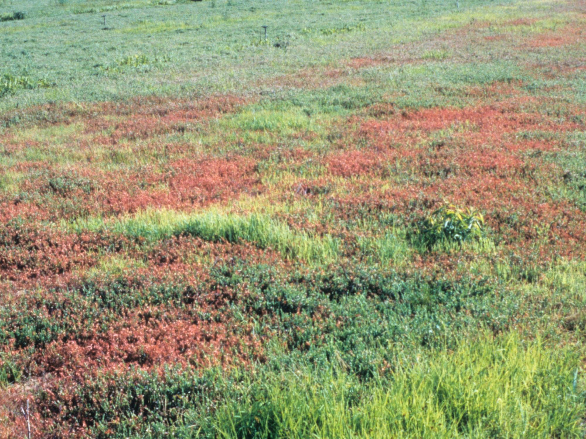 Description: Dans cette cannebergière, une partie du champ montre un dépérissement des tiges et des feuilles qui ont pris une teinte brune à rouge. Les tiges feuillées verticales sont les plus affectées. Ces plants ont souffert d’un manque d’eau à la suite d’une sécheresse survenue en juin.