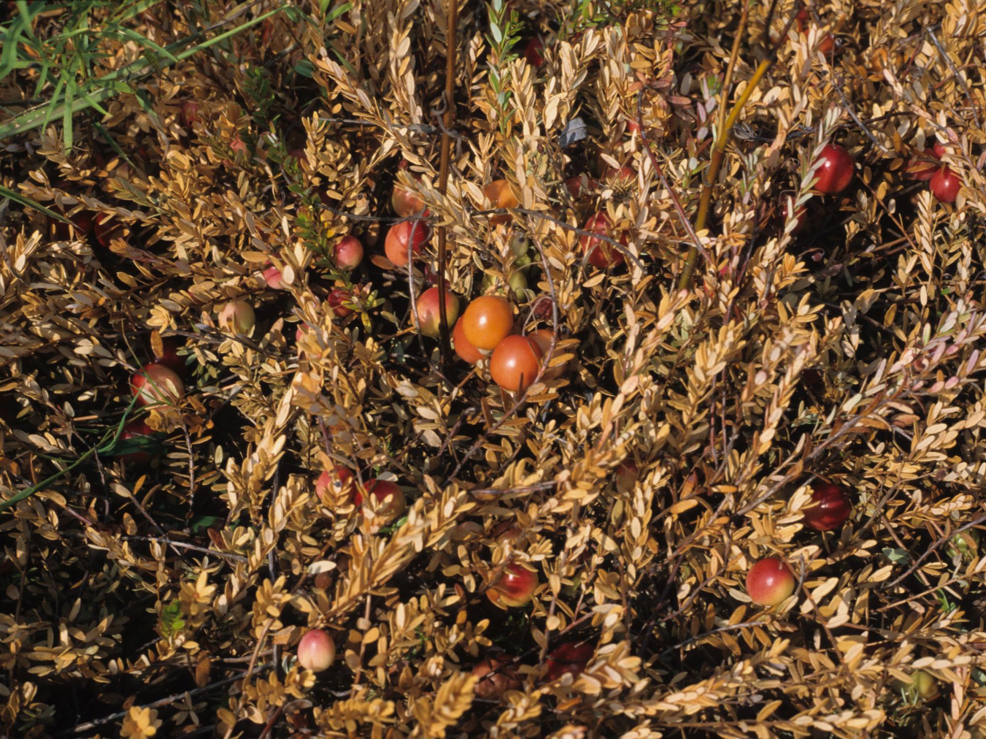 Légende: Feuillage brunâtre et canneberges orange