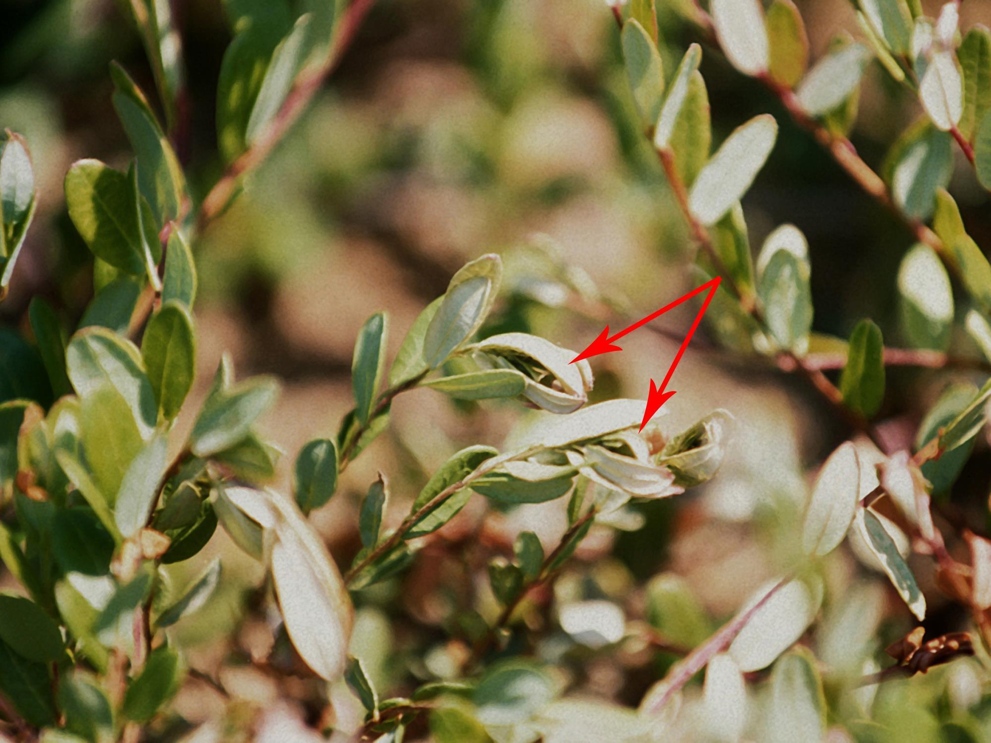 Description: Sur des plants de canneberges, les feuilles terminales couvrent le bourgeon en formant une coupe autour de lui (voir flèches). Le flétrissement de l'apex des plants est apparu à la suite d'un manque d'eau causé par une sécheresse survenue en juin.
