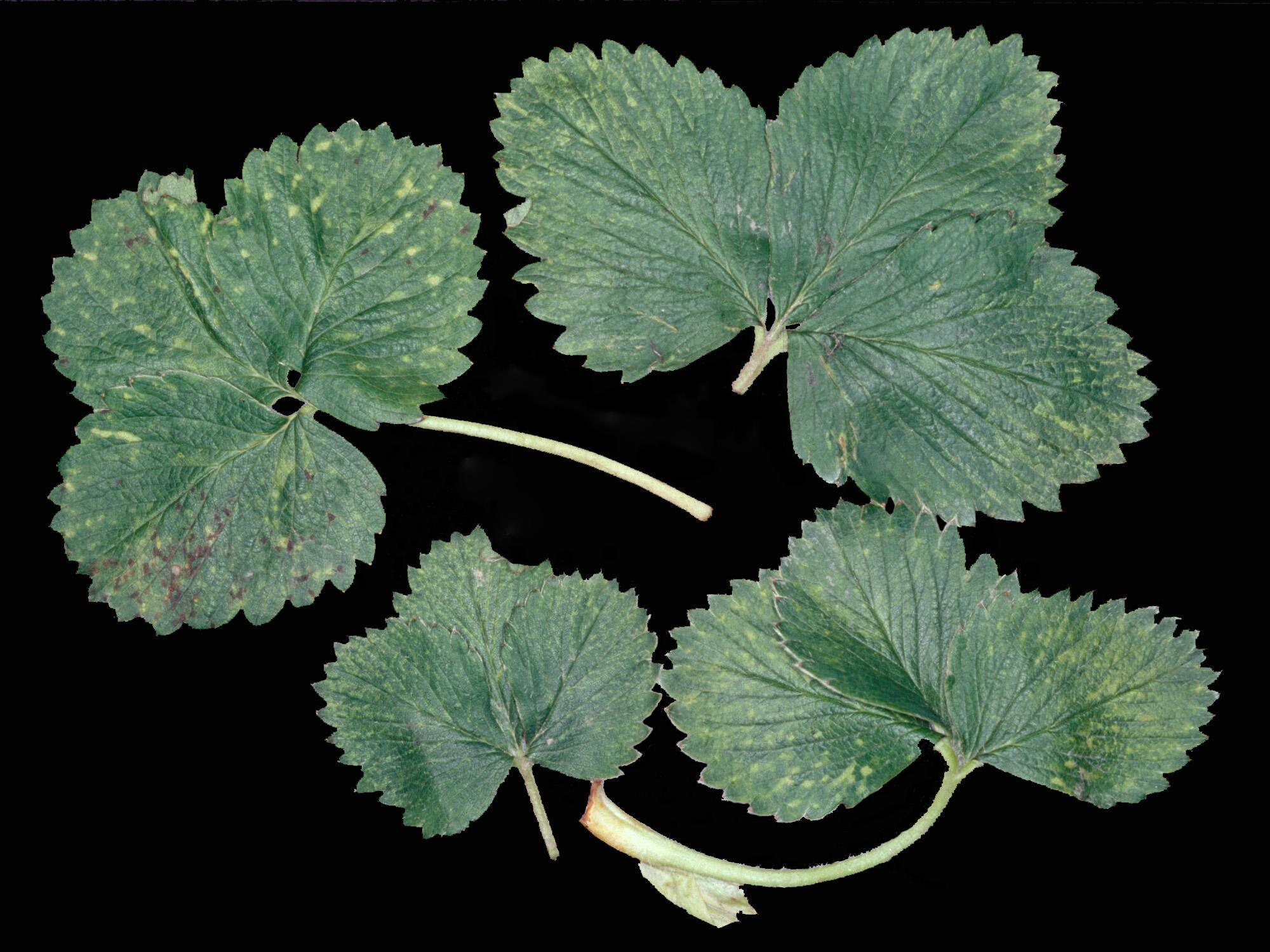 Description: Les feuilles de fraisier sont affectées par de nombreuses et minuscules taches blanchâtres à jaunâtres. Elles sont généralement plus nombreuses sur la moitié supérieure des folioles comparativement à leur partie basale. Elles ne sont apparentes qu'à la face supérieure. Ces taches surviennent habituellement à la suite du retrait de la paille et ont été observées sur plusieurs cultivars de fraisier chez plusieurs producteurs selon les conseillers agricoles. Ces taches peuvent être causées par la combinaison de deux facteurs non parasitaires : un taux d'ensoleillement important et une température élevée à la suite du retrait de la paille. Ces plants de fraisier ont été reçus au Laboratoire de diagnostic en phytoprotection du MAPAQ durant la semaine du 22 mai.