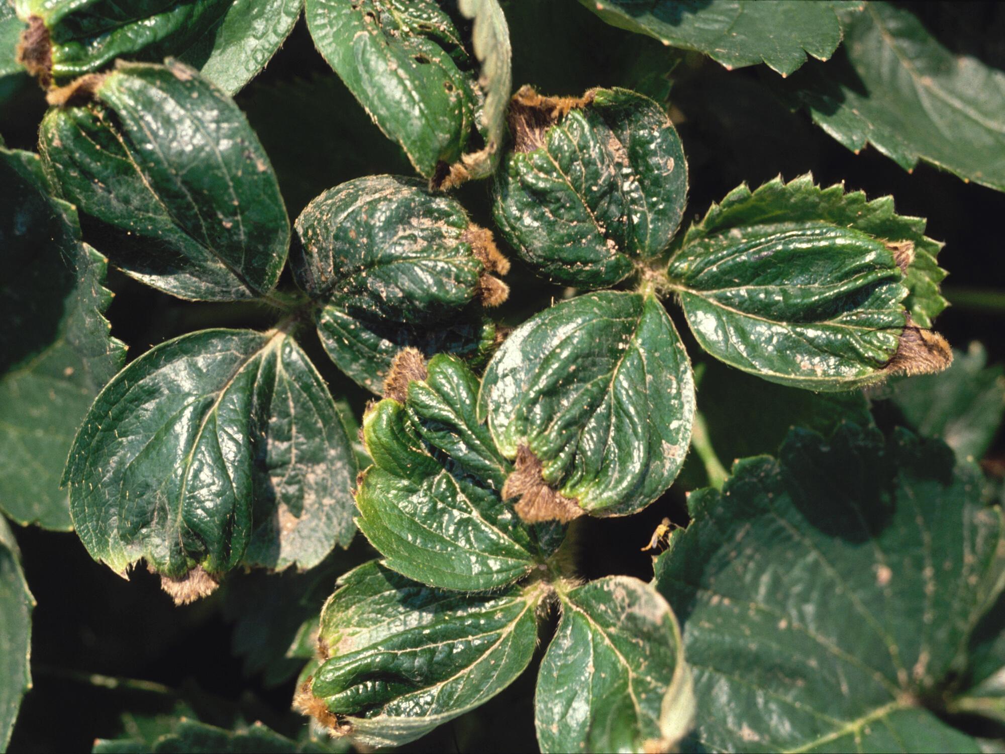 Description: L’extrémité des jeunes feuilles de fraisier est brûlée et montre une déformation et un gaufrage de l’apex. Ces dommages sont des symptômes caractéristiques d’une carence en calcium.