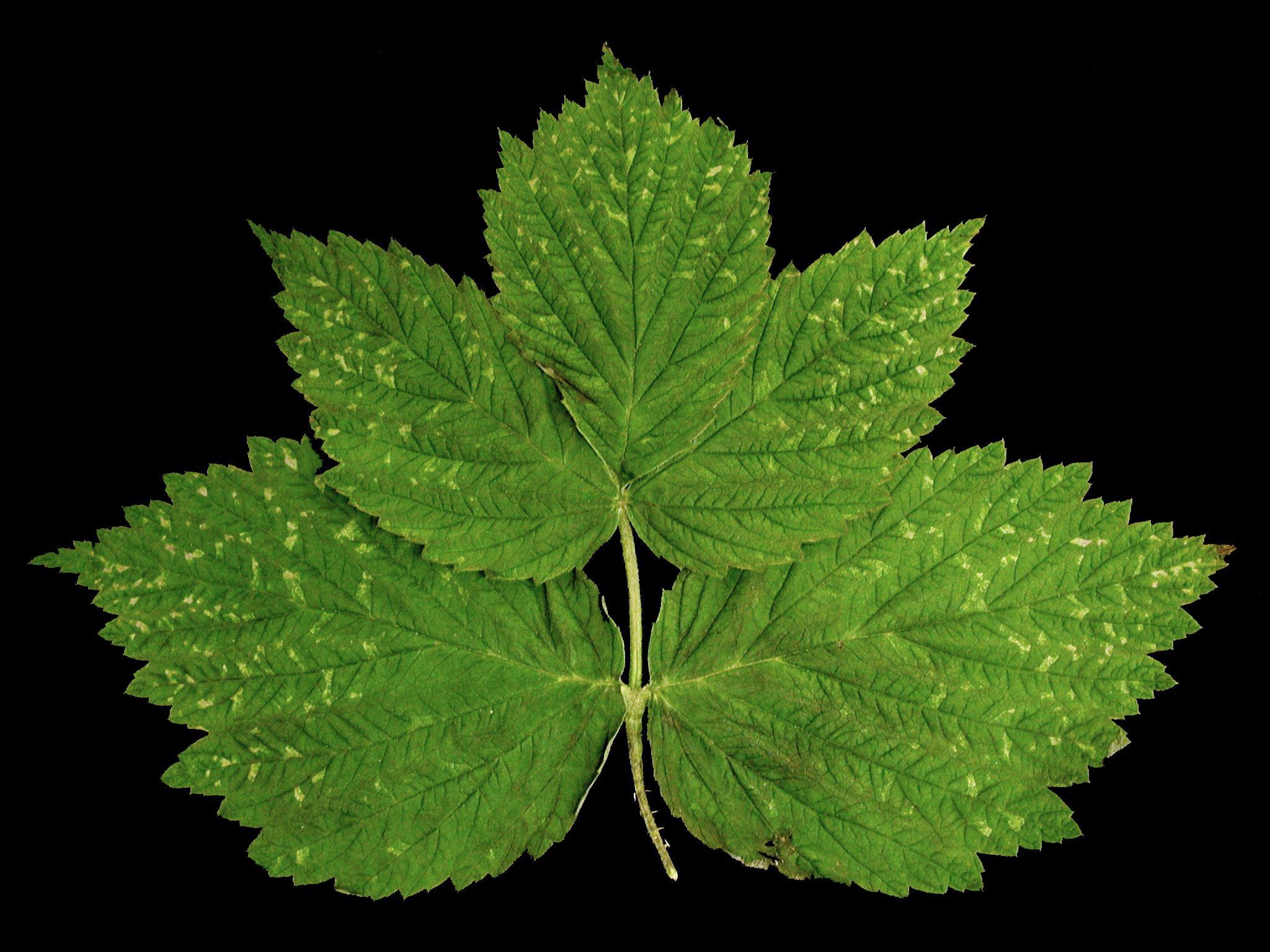 Description: Sur une feuille de framboisier, présence de petites taches translucides blanchâtres et angulaires mesurant moins de 1 mm de diamètre. Les taches sont distribuées de manière irrégulière ou régulière vers le pourtour des folioles. En microscopie, les cellules des feuilles sont turgescentes, mais elles contiennent peu ou pas de chlorophylle. Aucun agent pathogène ni ravageur n'a été détecté des dommages.   À la suite à ce constat, des conditions climatiques néfastes sont probablement impliquées. Une forte intensité lumineuse, combinée à une température froide la nuit, peut causer de tels dommages. Au laboratoire de diagnostic en phytoprotection du MAPAQ, ce type de dommages a déjà été observé au champ chez le fraisier.