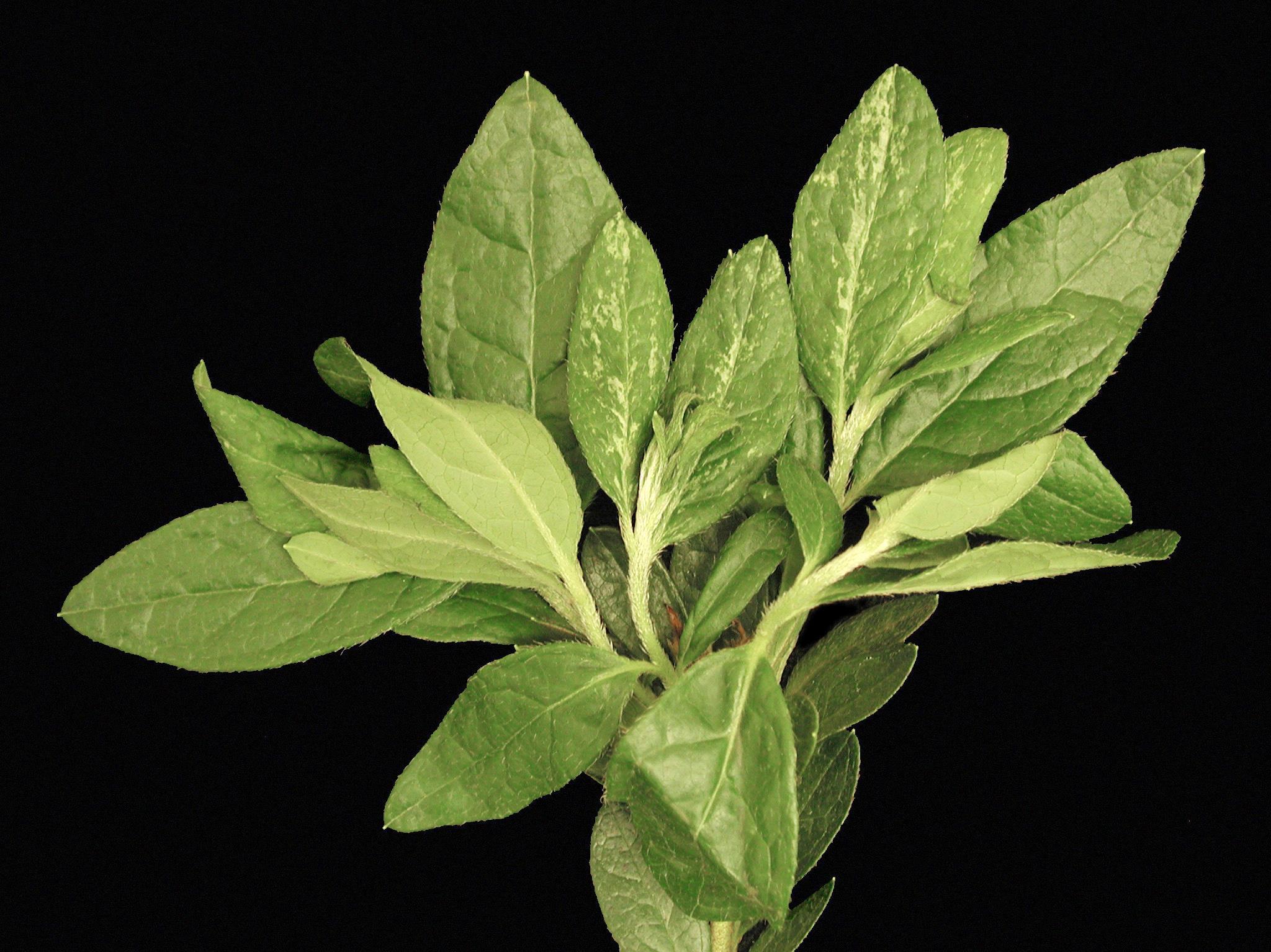 Description: Les feuilles d’un rhododendron (cv 'Promise') cultivée en serre présentent une importante mosaïque irrégulière et blanche. L’anomalie de coloration est répartie sur l’ensemble du limbe. Les symptômes sont présents uniquement sur les feuilles terminales. Les tests de laboratoire se sont avérés négatifs pour la détection de virus.