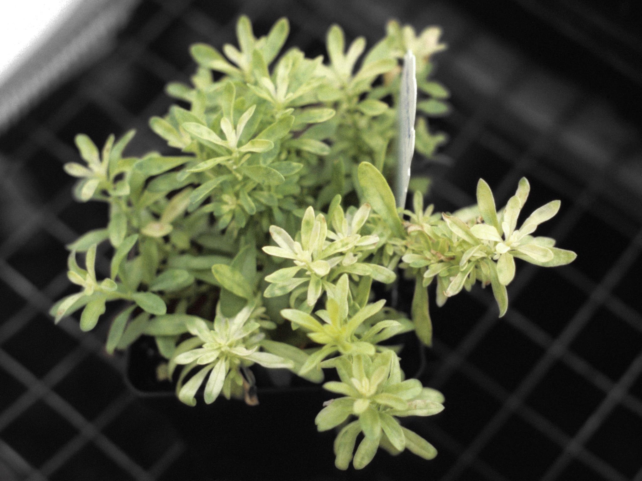 Description: Un plant de calibrachoa montre de jeunes feuilles jaunes à blanches. L’analyse du substrat a révélé un pH trop élevé (> 6,3). Le plant montre une carence en fer induite par un pH trop élevé.