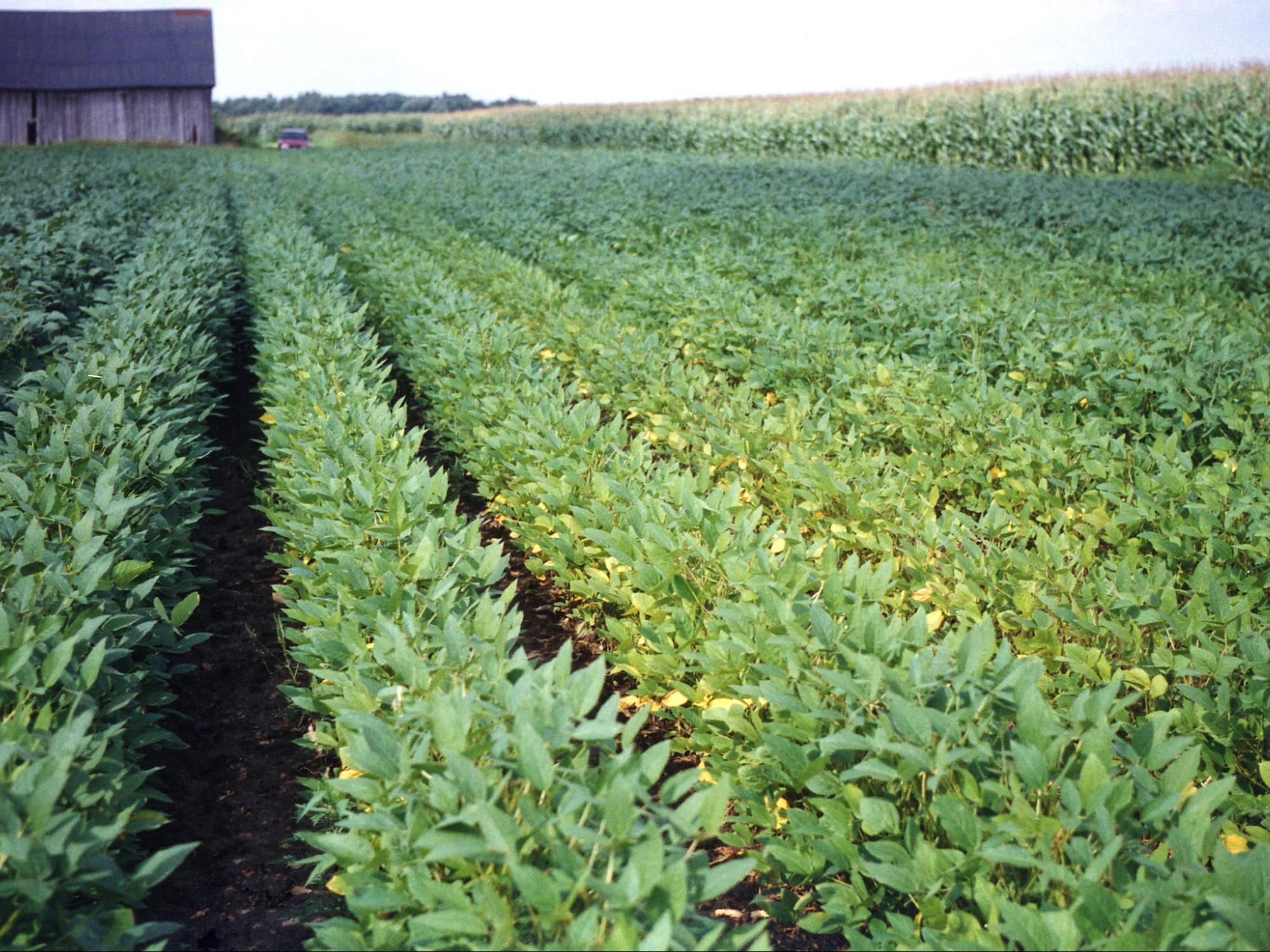 Description: C’est une culture de soya sans herbicide cultivée dans une baissière avec un surplus d’eau. Dans cette zone, le drainage du champ est déficient. Ces plants sont jaunes et ont une croissance ralentie par rapport au reste du champ. Ce retard de croissance peut être relié à une asphyxie racinaire.