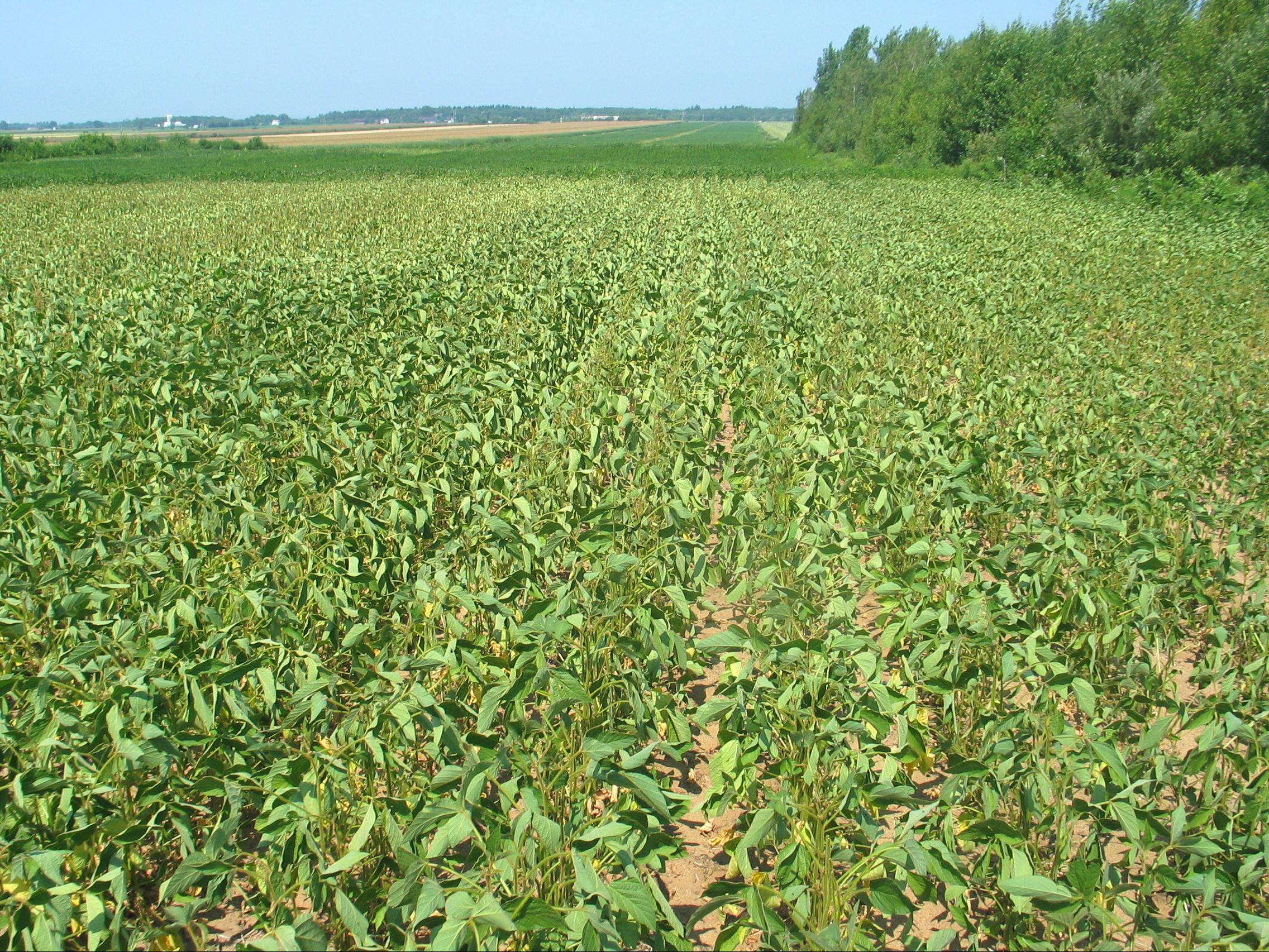 Description: Un champ de soya montre des zones de plants jaunis. Les plants situés au premier plan ont des feuilles flétries et parfois enroulées. Ces symptômes sont causés par le manque d’eau dans le sol occasionné par une très grande sécheresse (2007).