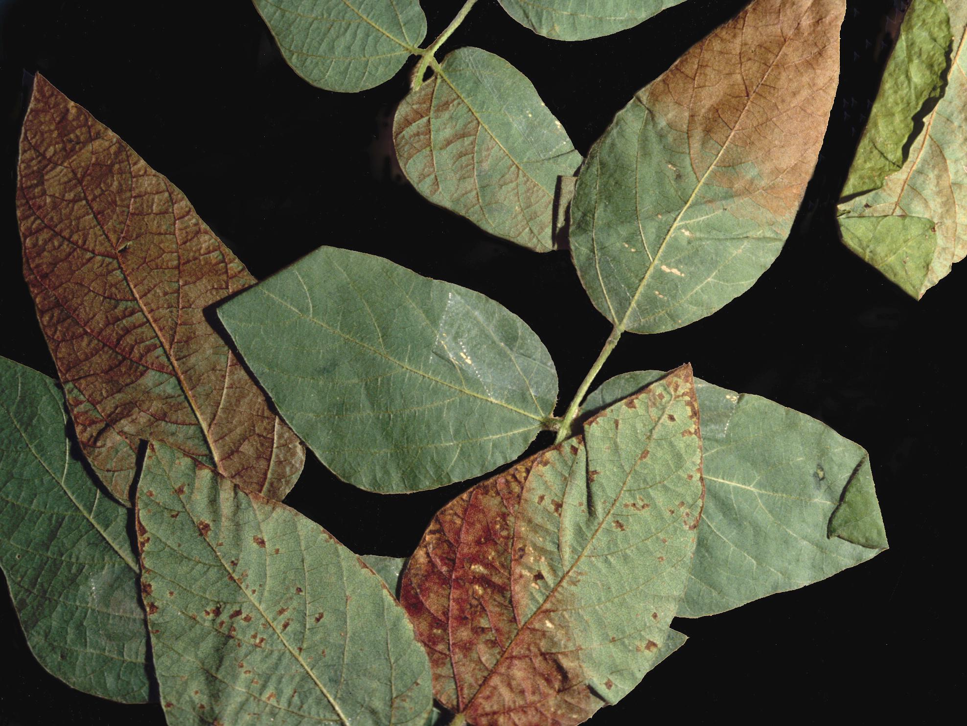 Description: À la face inférieure des folioles de soya, présence d’une brûlure rouille à brune sur une partie du limbe. La délimitation entre les tissus affectés et les tissus sains est nette. Ce symptôme est caractéristique d’une insolation survenue lors de journées venteuses et très ensoleillées avec une température élevée. Sur ces folioles, l’insolation est visible à l’apex, à la base de la feuille, sur la moitié d’une feuille ou sur la feuille entière.
