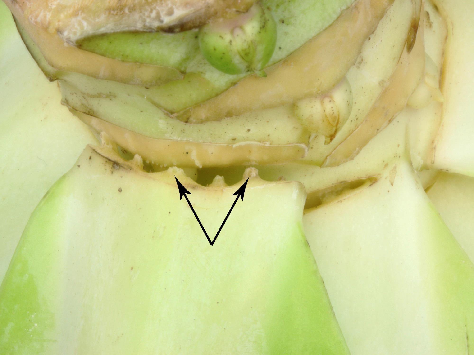 Description: À la face supérieure d’une feuille basale et enveloppante d’un chou pommé (cv 'Bartolo'), présence de protubérances vitreuses, beiges et d’une texture liégeuse. Elles sont localisées près de l’attache de la feuille sur la tige (voir flèches). Aucun agent pathogène n’a été détecté des dommages. Quelques thrips de l'oignon (Thrips tabaci) ont été observés, mais en quantité insuffisante pour expliquer les dommages. Le résultat des tests de laboratoire, la nature des dommages et la forte proportion de plants affectés au champ (90 %) confirment la présence d'œdème sur la feuille.