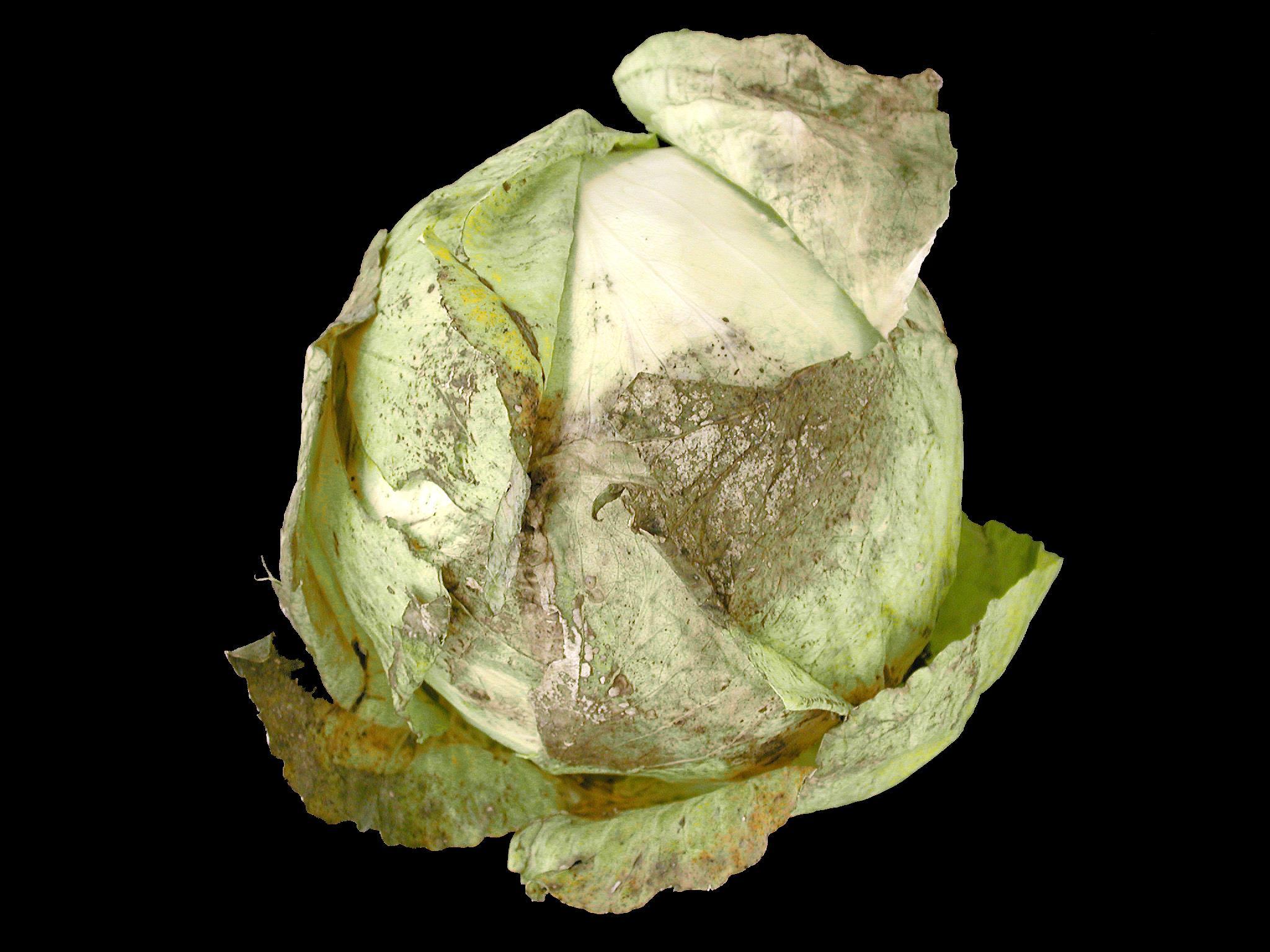 Légende: Taches brunes sur feuilles externes d'un chou pommé