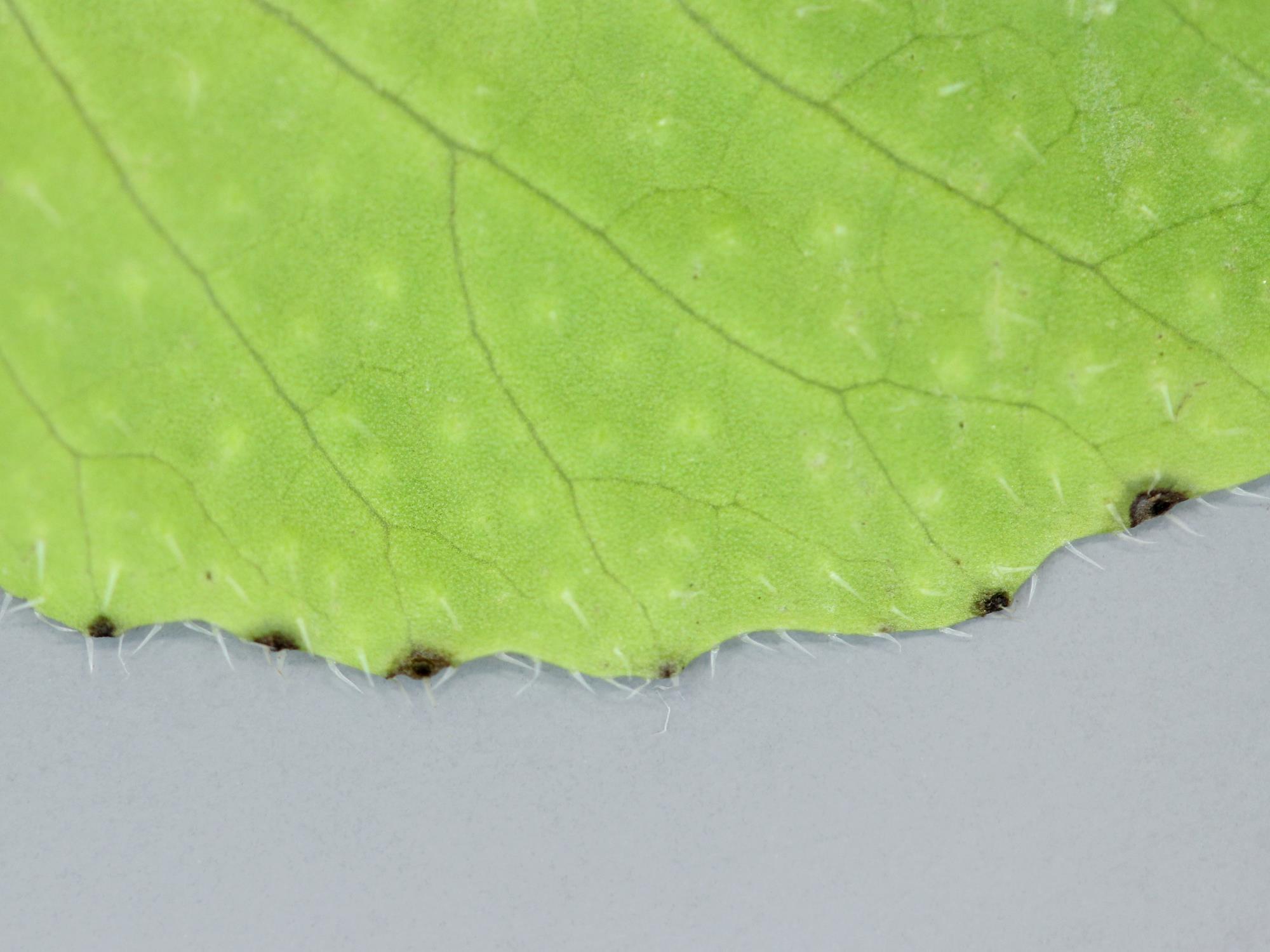 Description: Une vue rapprochée d’une feuille d’un transplant de chou chinois provenant d’une serre montre la présence de petites taches noires uniformément disposées à la marge de la feuille et correspondant à l'emplacement des hydatodes. Ce dommage est caractéristique de la guttation.