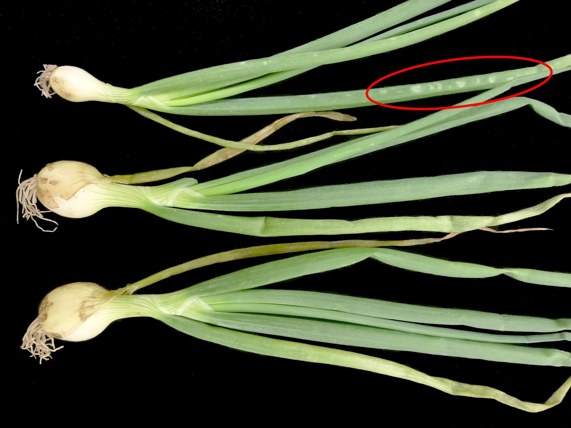 Description: Sur le plant en haut de l’image, présence de taches blanchâtres (voir cercle), au contour irrégulier, localisées sur un seul côté de quelques feuilles. Notez que les symptômes sont moins bien définis sur les deux autres plants. Les tests de laboratoire se sont avérés négatifs pour la détection de bactérie, champignon et virus. Les renseignements transmis par la conseillère agricole mentionnent la présence de fortes pluies accompagnées de vents violents avant l’apparition des symptômes. En se basant sur le caractère non évolutif des symptômes, sur les événements climatiques et la distribution généralisée du problème au champ, les symptômes foliaires seraient la conséquence de blessures causées par de la pluie forte poussée par des vents violents.