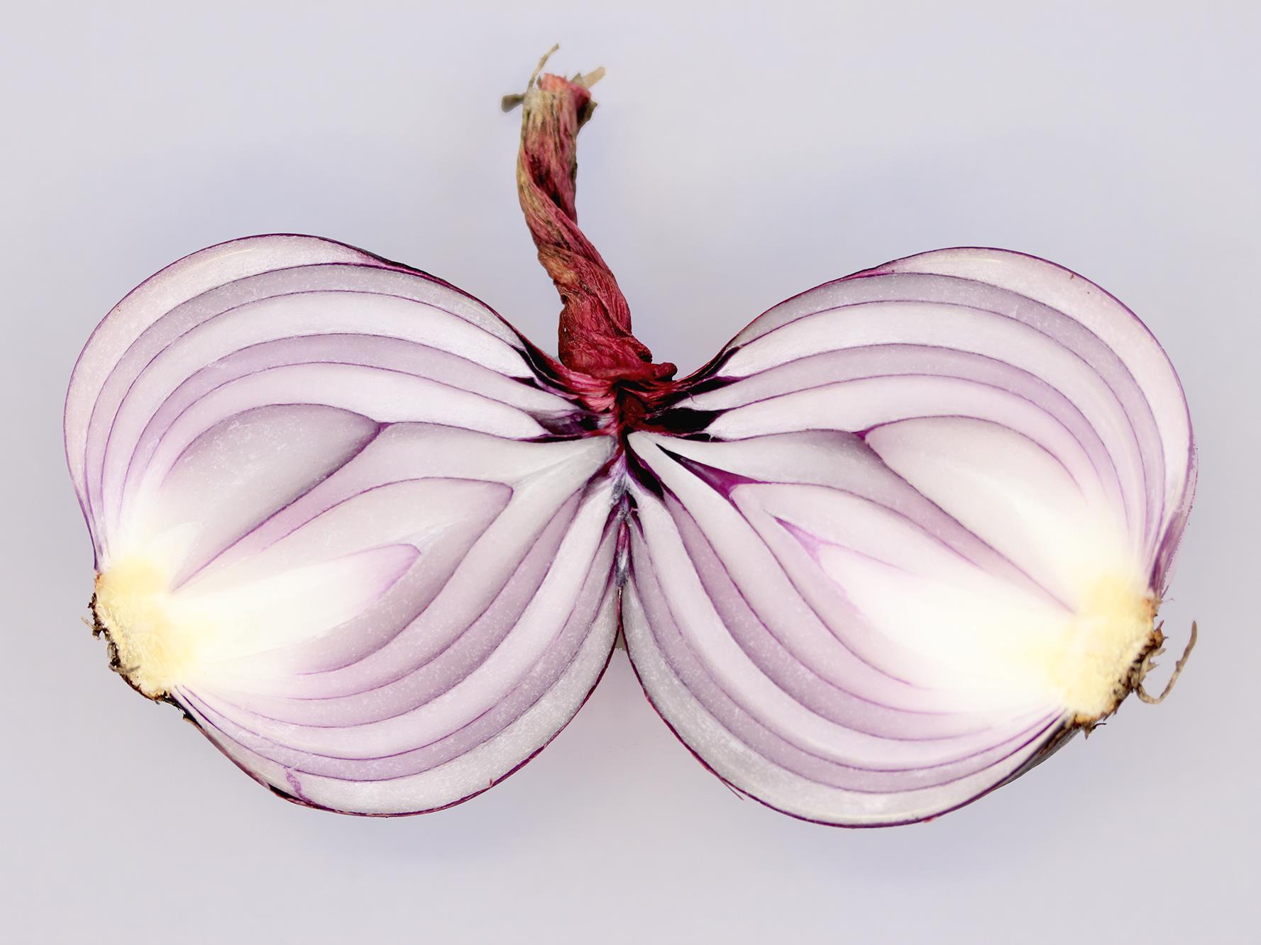 Description: Sur un bulbe d'oignon rouge coupé en deux, on aperçoit une anomalie de coloration blanchâtre près du plateau racinaire. Ce blanchiment correspond à une tache blanche présente sur les tuniques externes du bulbe. Ce symptôme est caractéristique d’une insolation (journée très ensoleillée) jumelée à une température élevée et des conditions sèches. Cet échantillon provient d’un champ où les oignons étaient arrachés et séchaient en andain sur une terre noire. Les bulbes qui étaient sur le dessus sont les plus affectés, car ils sont exposés directement aux rayons du soleil.