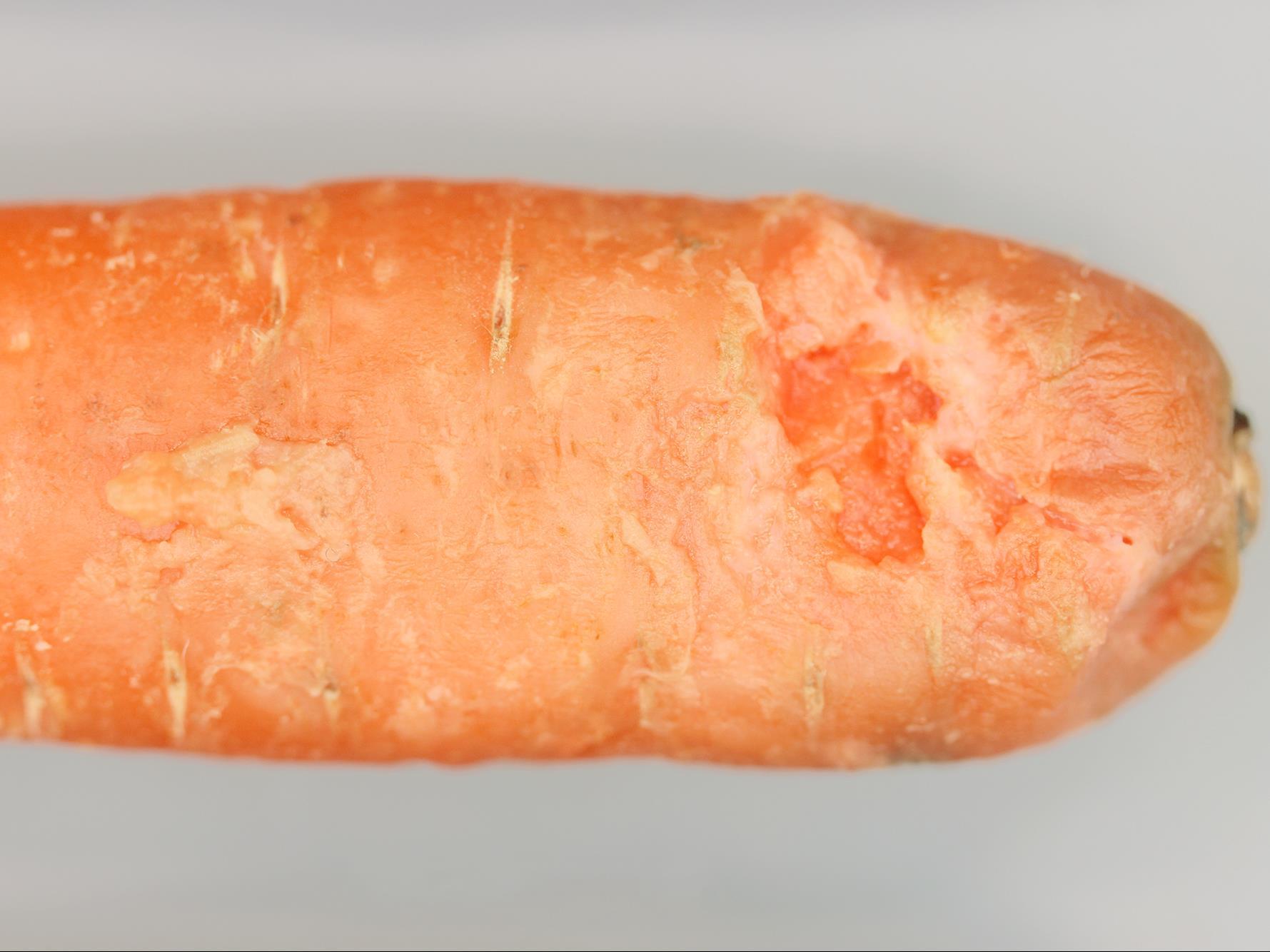 Description: Une vue rapprochée de l’épiderme d’une carotte provenant d’un entrepôt présente des zones de pourriture molle qui progresse dans la racine. Les tissus se désagrègent dans ces zones. Les tests de laboratoire ont révélé la présence de bactéries secondaires et des levures. Les bactéries secondaires n’ont pas la capacité de pénétrer directement les tissus végétaux sains, car elles ne sont pas pectinolytiques, mais peuvent dégrader des tissus déjà endommagés. Quant aux levures, elles sont rapportées pour causer des pourritures d’entreposage chez la carotte. Leur développement est favorisé par des conditions chaudes et humides. Des pourritures liées aux levures apparaissent généralement lorsque les conditions d’entreposage sont inadéquates en matière de température et de ventilation.
