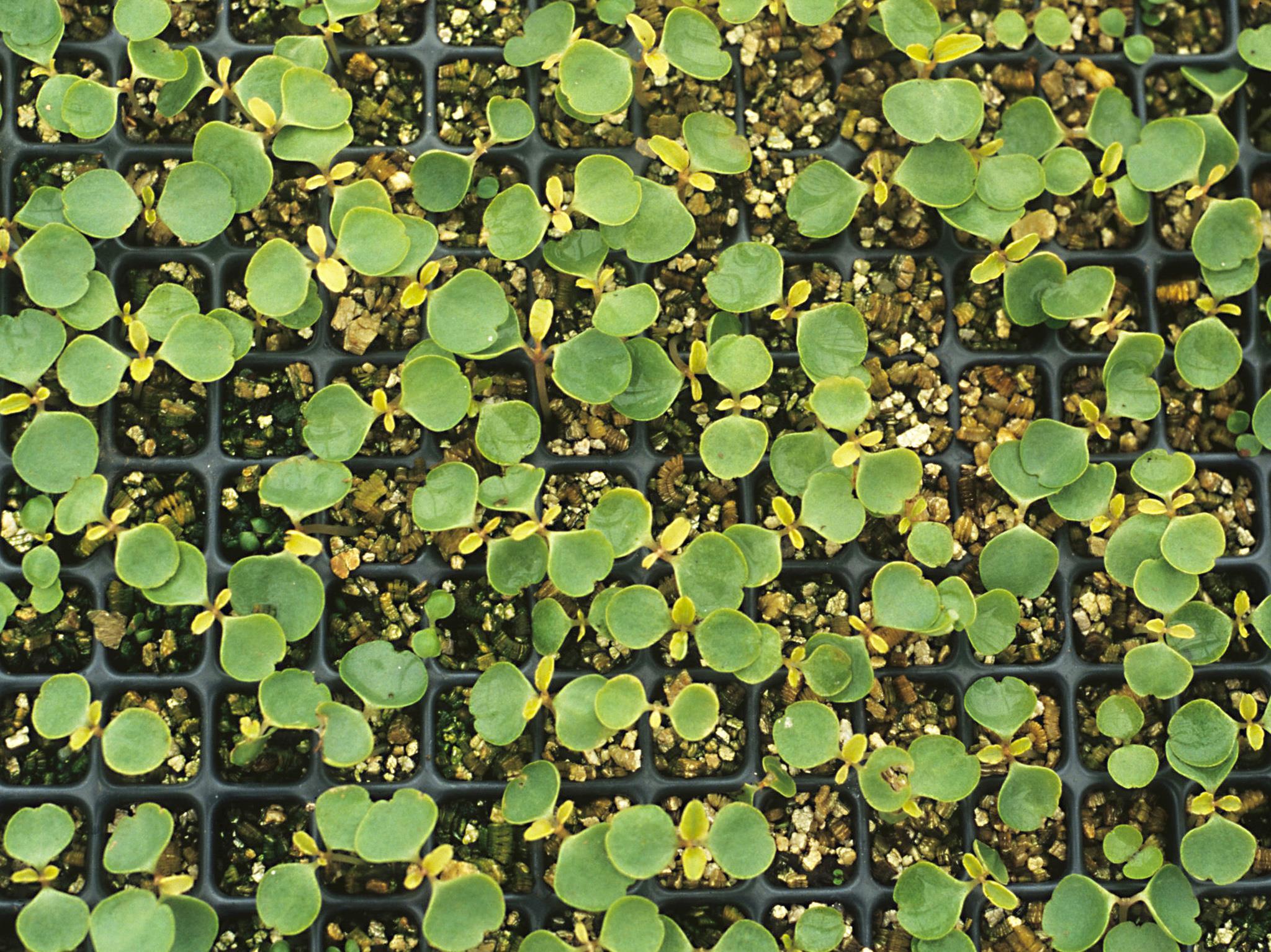 Description: Sur des plantules d’impatientes communes cultivées en serre, présence d’un jaunissement complet des cotylédons et de la marge des premières vraies feuilles. L’apex des feuilles est déformé et le limbe est parfois gaufré. Les symptômes observés sur ces plantules sont caractéristiques d'une carence en bore. Dans ce cas, la carence en bore a été corrigée avec un traitement foliaire à faible dose de bore soluble (Borax).