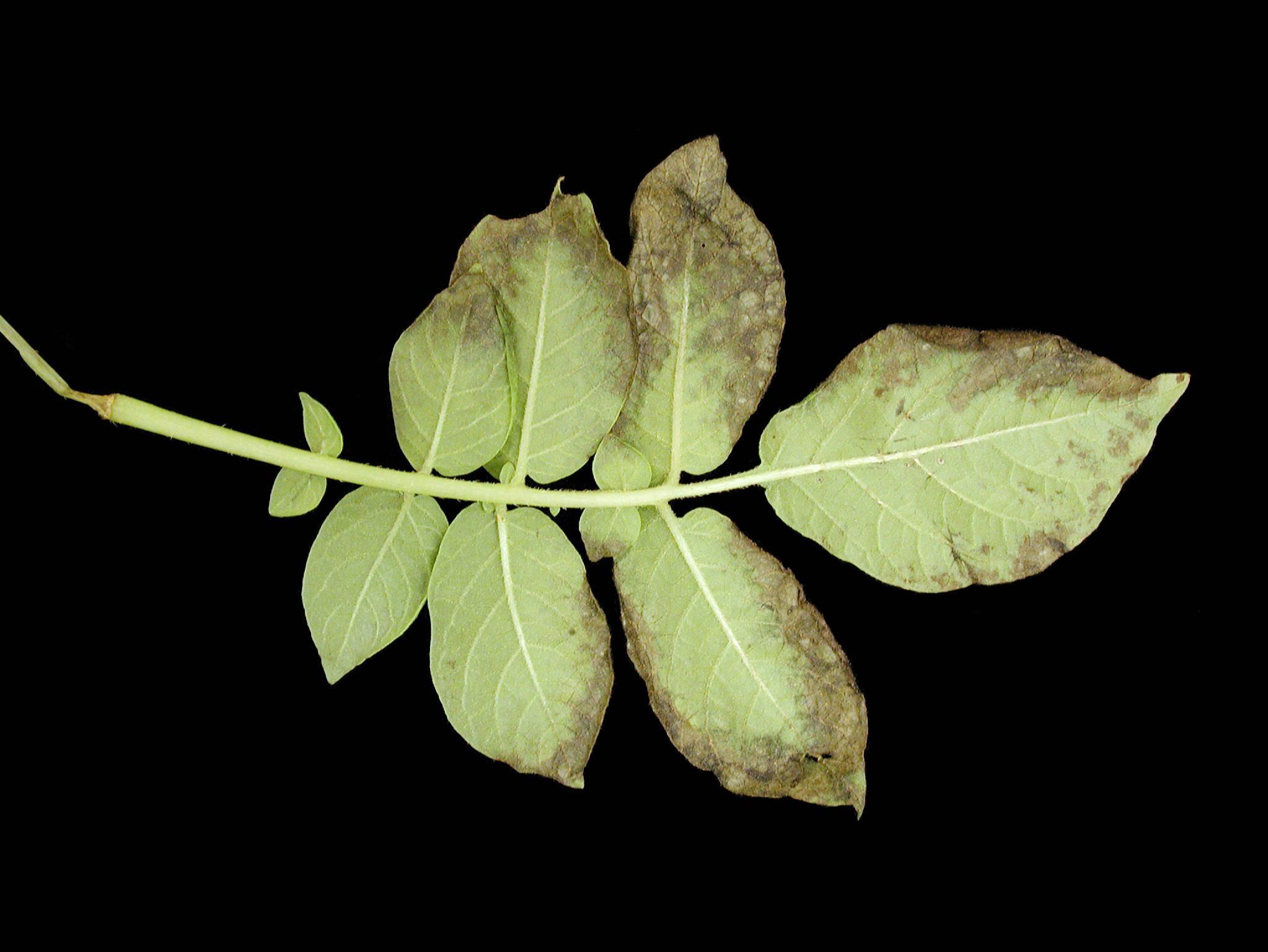 Description: À la face inférieure d’une feuille de pomme de terre (cv 'Goldrush'), présence d’un brunissement des folioles qui affecte surtout les feuilles terminales, mais également quelques feuilles médianes et basales. Le brunissement débute à la marge et progresse entre les nervures. Les symptômes présents sur les feuilles sont caractéristiques de ceux produits par l’action de polluants atmosphériques comme l’ozone.
