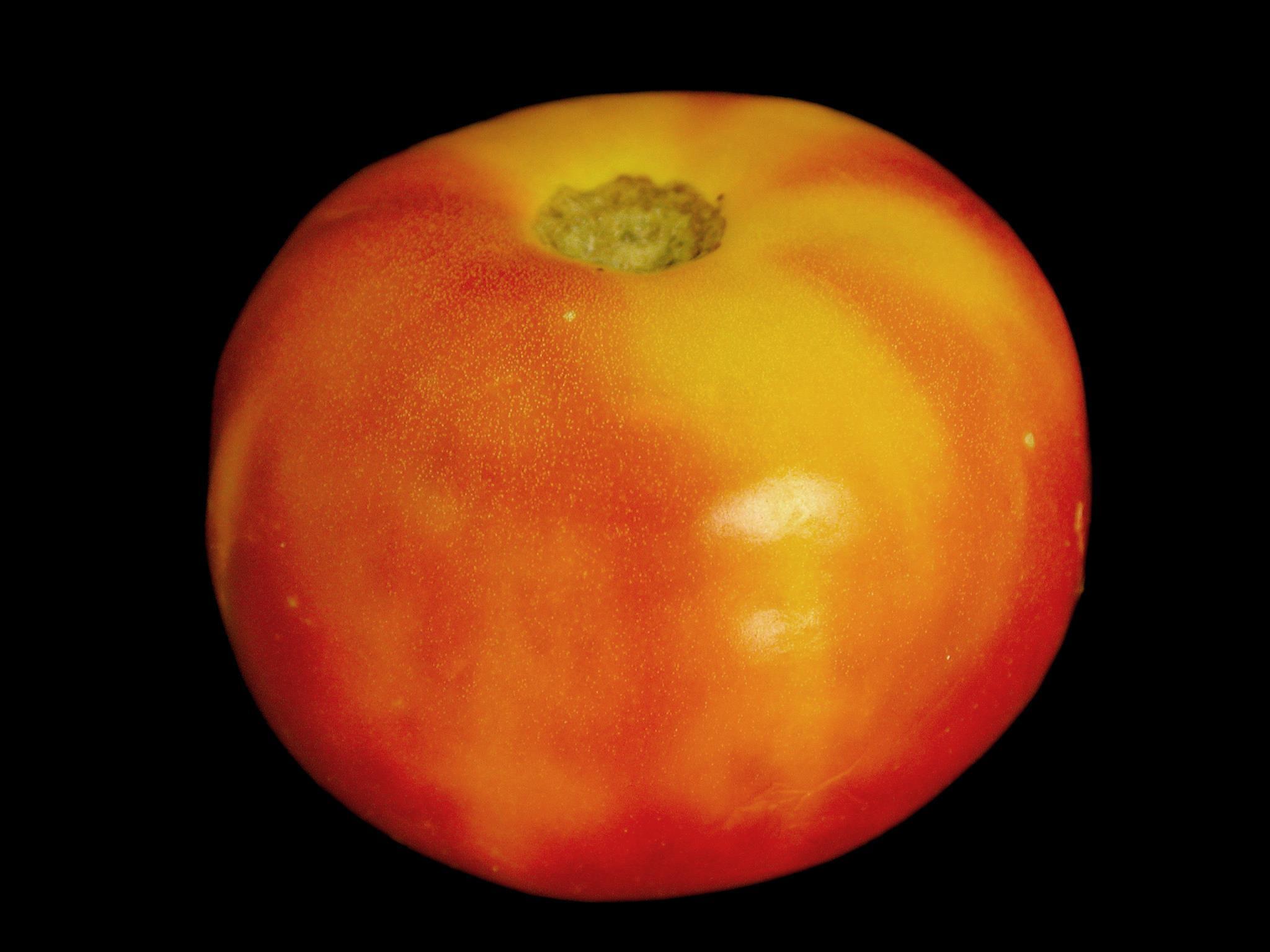 Description: Une tomate de champ montre un jaunissement partiel dans la zone pédonculaire, à l’épaule du fruit. La chair jaune est plus dure que la chair rouge. Ce symptôme est caractéristique du collet jaune chez la tomate. Le conseiller agricole mentionne que 10 à 20 % des fruits sont affectés, que la température a été élevée toute la saison et que des pluies abondantes sont survenues.