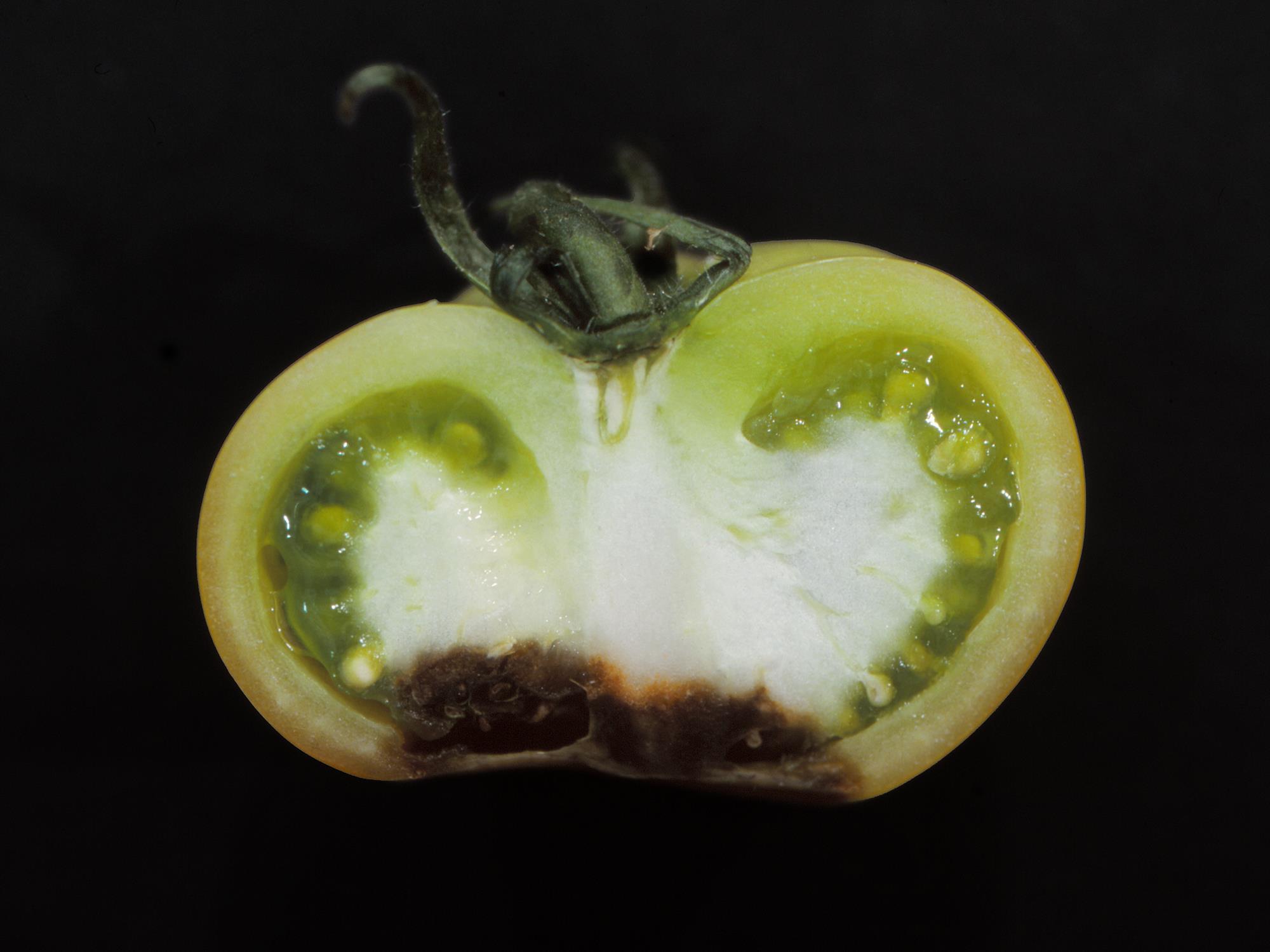 Description: Une coupe longitudinale effectuée dans une tomate verte (cv ‘Trust’) provenant d’une serre montre que la zone renfoncée brunâtre, sèche et ferme, observée à l’apex pénètre une certaine profondeur dans le fruit. Ce symptôme est caractéristique de la pourriture apicale chez la tomate. Elle est causée par une carence en calcium.