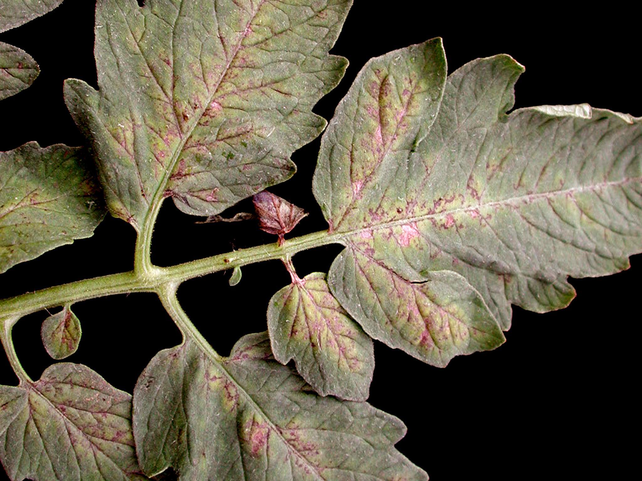 Légende: Brunissement longeant les nervures sur folioles de tomate