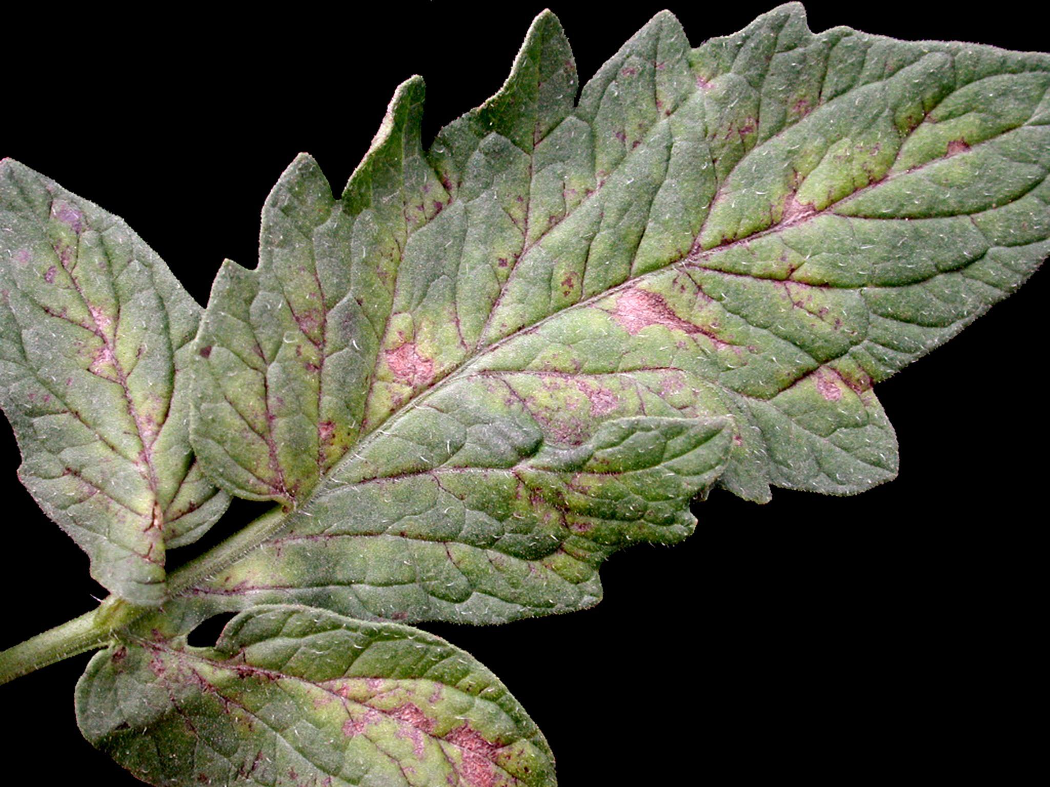 Légende: Brunissement longeant les nervures sur foliole de tomate