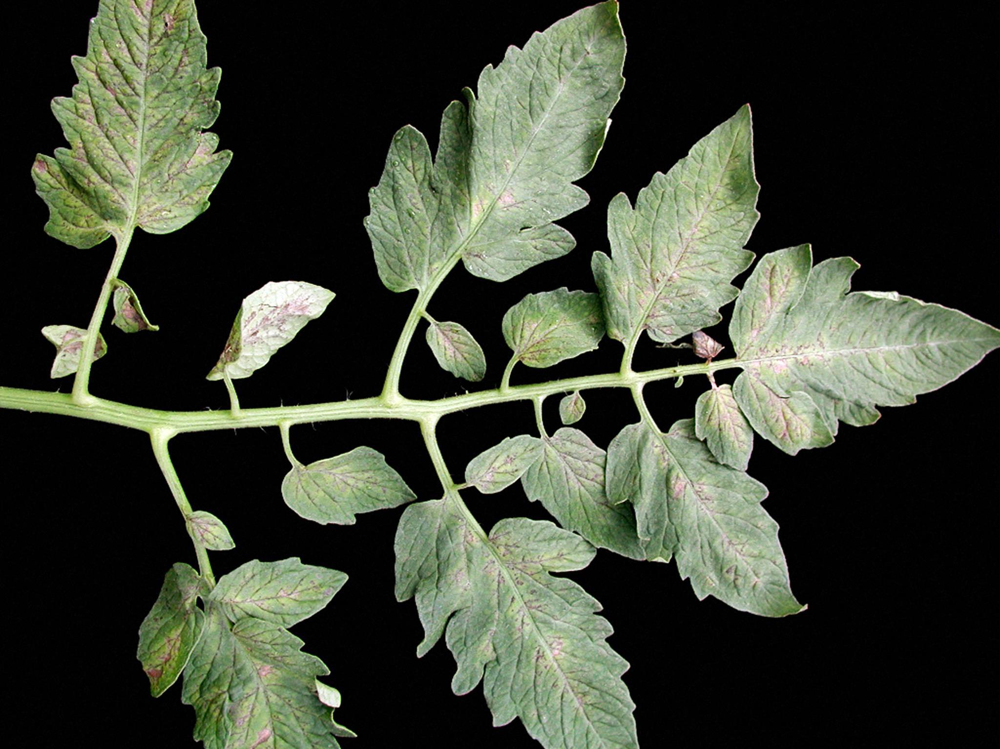 Description: Une feuille de tomate de serre (cv 'Trust') présente un brunissement localisé le long des nervures principales. Le brunissement est constitué d’une multitude de petites ponctuations qui sont regroupées. Les symptômes évoluent en de larges brûlures brunes localisées également le long des nervures. Les symptômes sont plus graves à la base des folioles. Un très léger jaunissement borde les brûlures. L’analyse minérale des tissus foliaires a révélé une toxicité en manganèse (836 ppm). La teneur en manganèse doit se situer entre 55 et 385 ppm. Environ 75 % des plants étaient affectés.